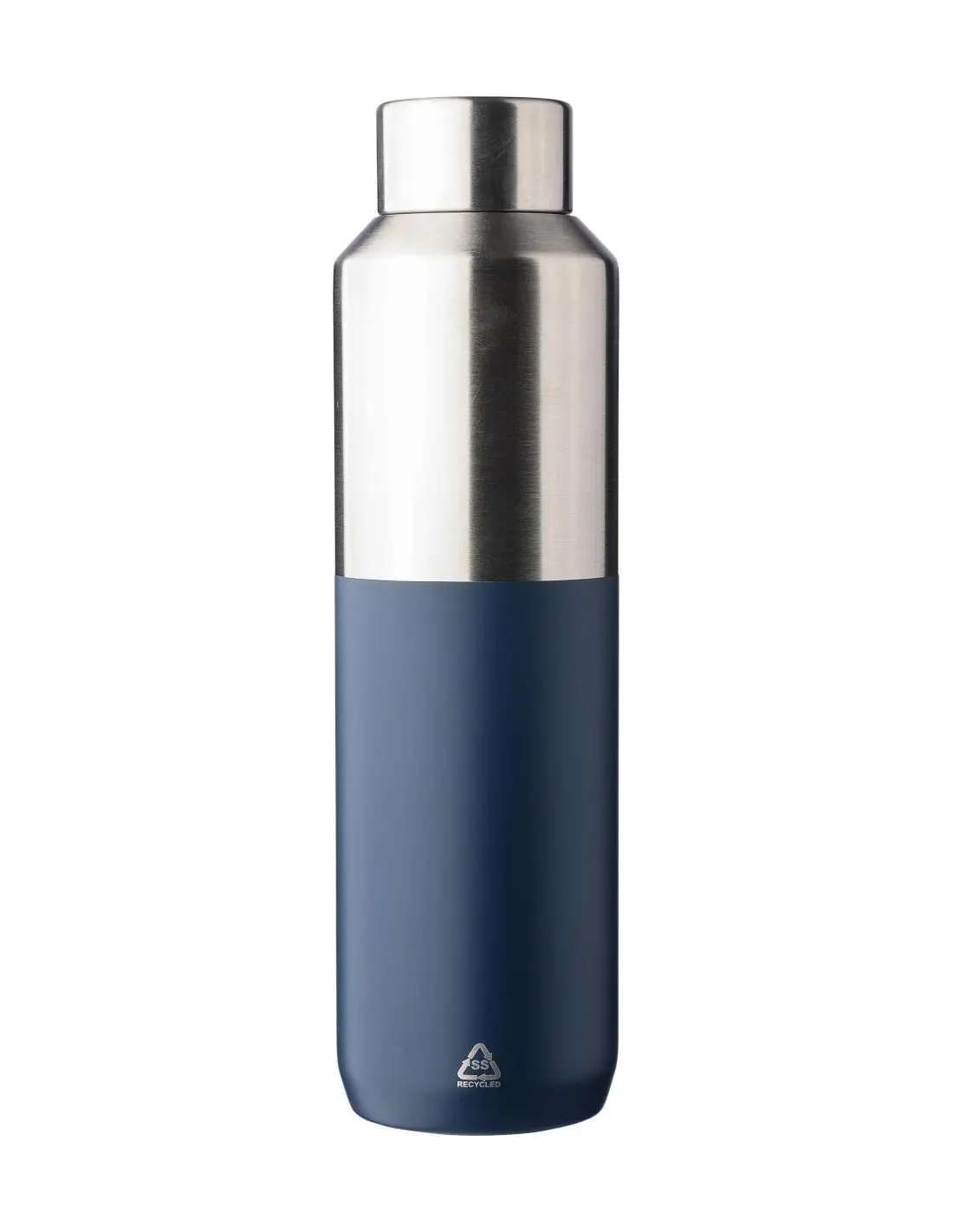 Botella termo de acero inoxidable reciclado (600 ml). Aislamiento al vacío de doble pared con un interior de acero inoxidable 304 y un exterior de acero inoxidable 201. Cuenta con una tapa de PP y una parte superior de acero inoxidable 201. Incluye un logotipo reciclado grabado en la parte frontal. Presentada en una caja de cartón marrón.