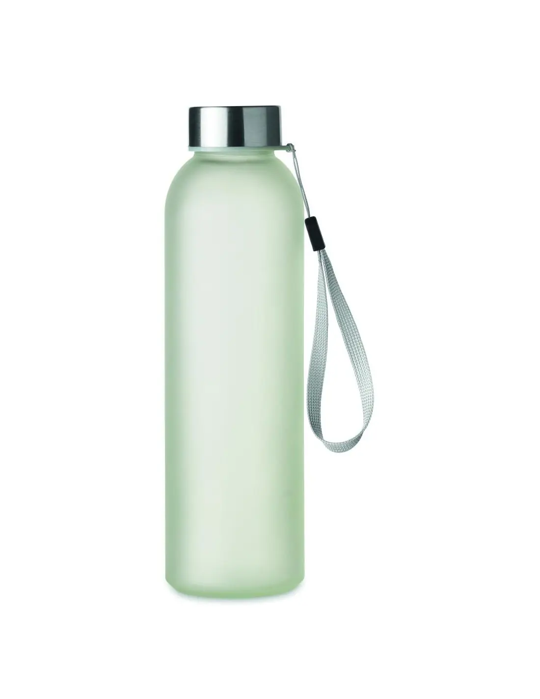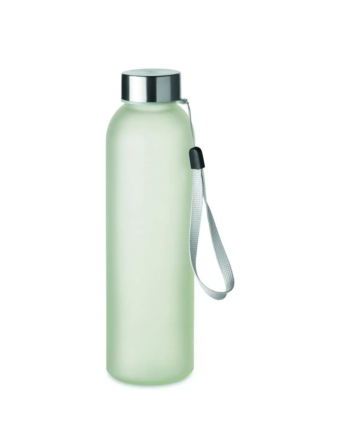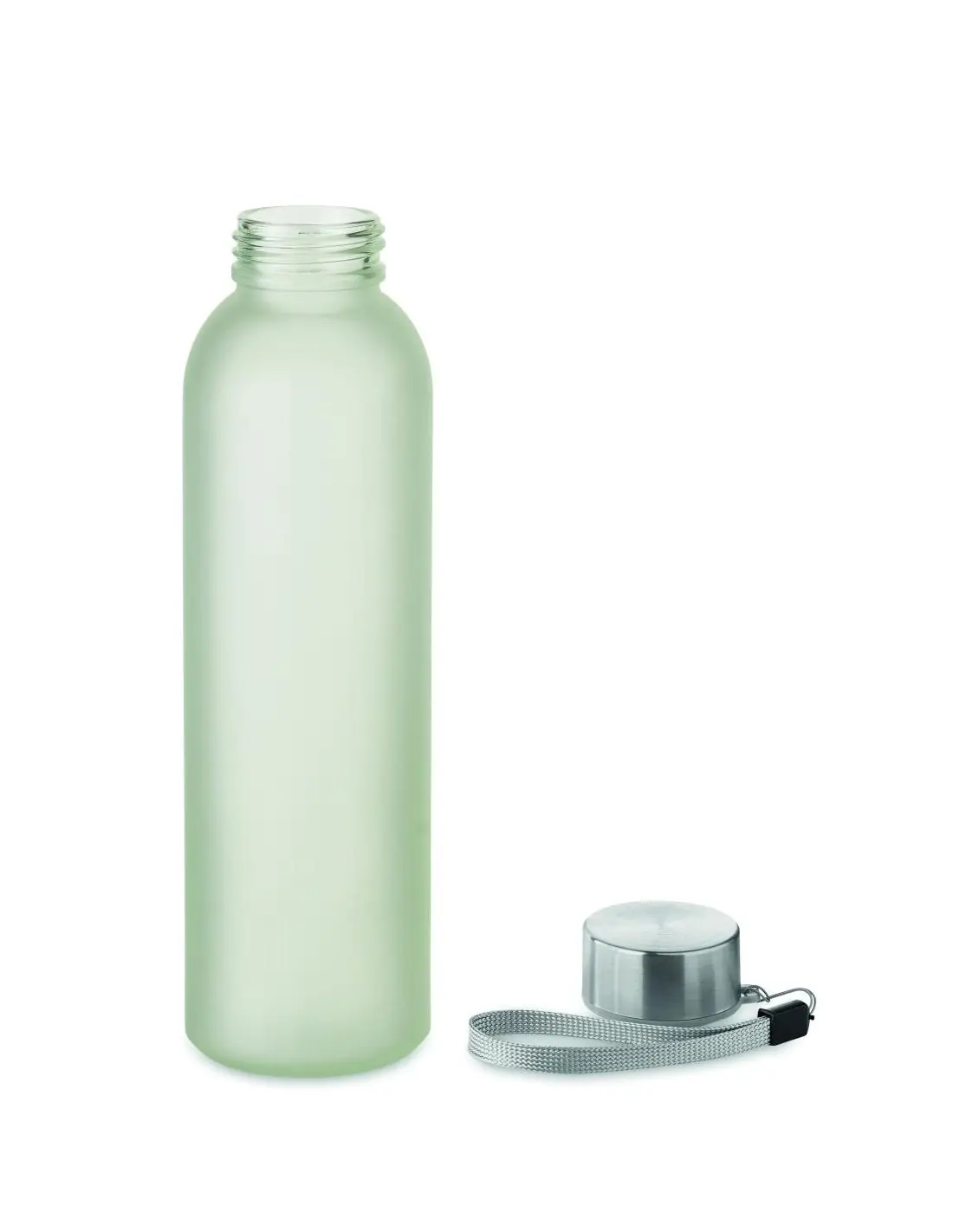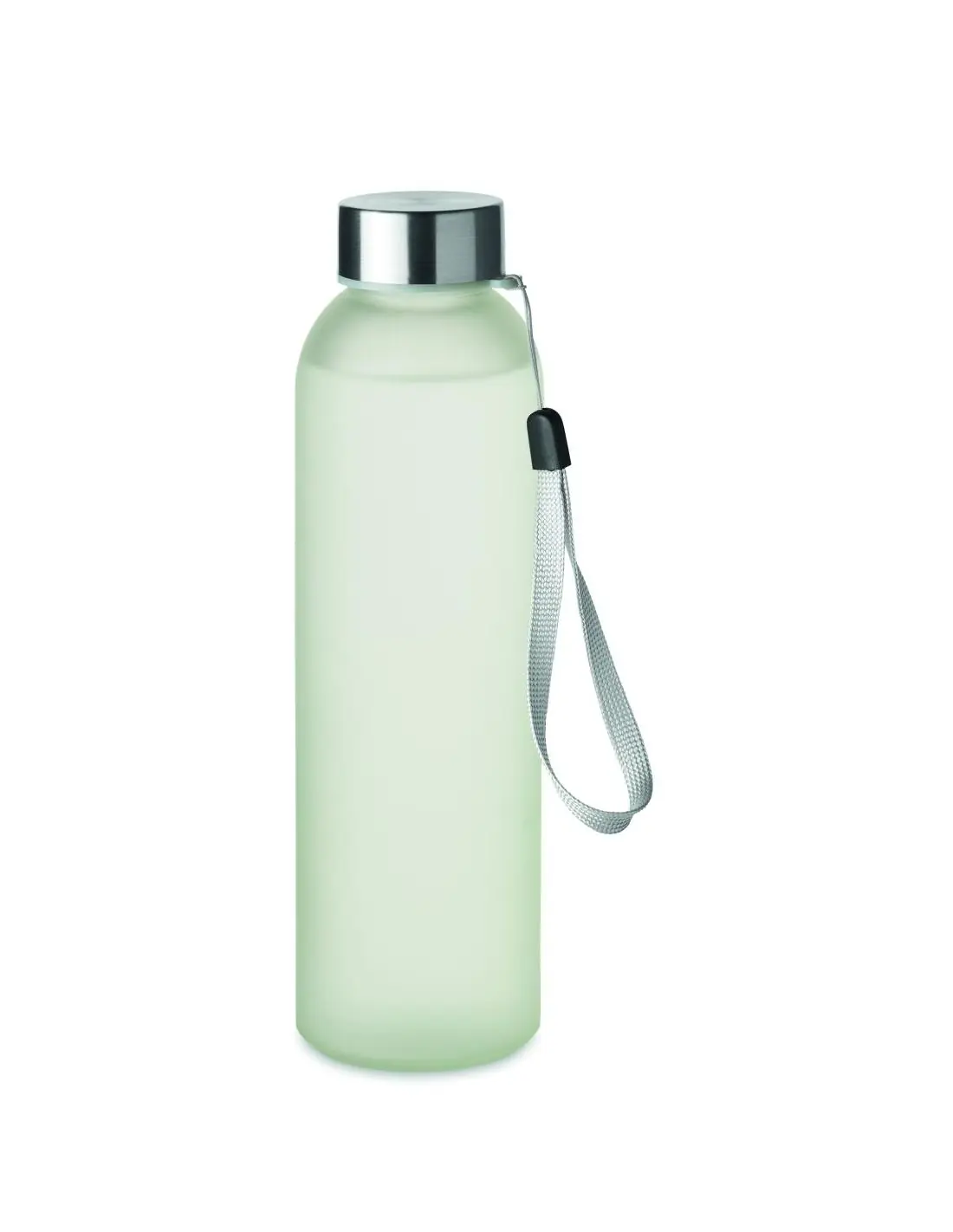Botella de vidrio con revestimiento especial para sublimación. Con tapa de acero inoxidable y asa para colgar. Capacidad: 500 ml.