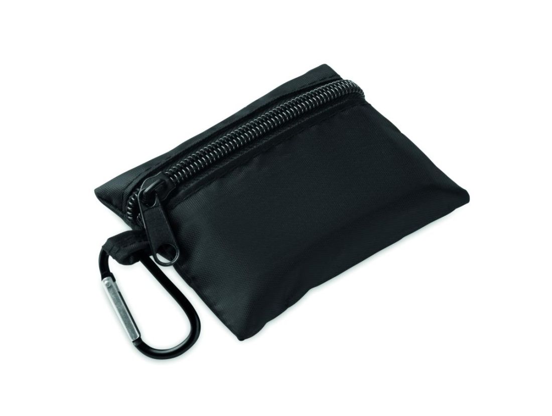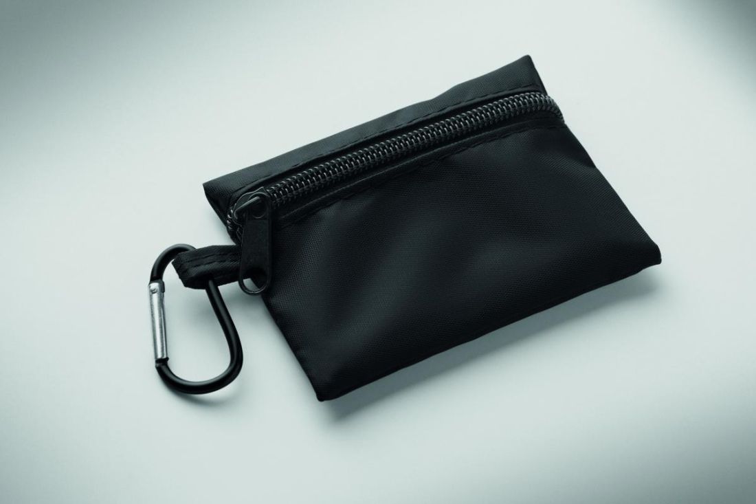 Botiquín compacto en bolsa de RPET con mosquetón de aluminio. Incluye 4 torundas con alcohol, 3 tiritas, 2 vendas, 2 gasas, 1 esparadrapo y 1 tijer…