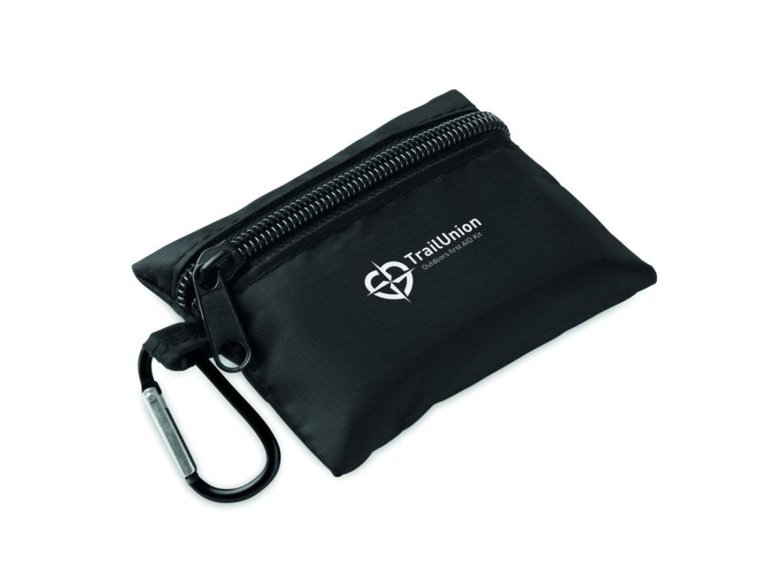 Botiquín compacto en bolsa de RPET con mosquetón de aluminio. Incluye 4 torundas con alcohol, 3 tiritas, 2 vendas, 2 gasas, 1 esparadrapo y 1 tijera. No disponible para la venta fuera de la UE.