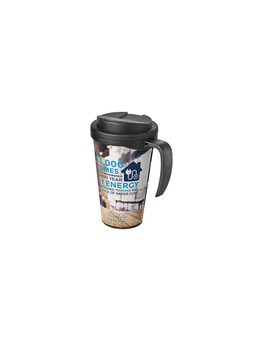 Taza con aislamiento de doble pared y tapa segura a prueba de derrames. La capa exterior de la taza está hecha de plástico reciclado. La taza presenta un diseño envolvente a todo color, moldeado en...