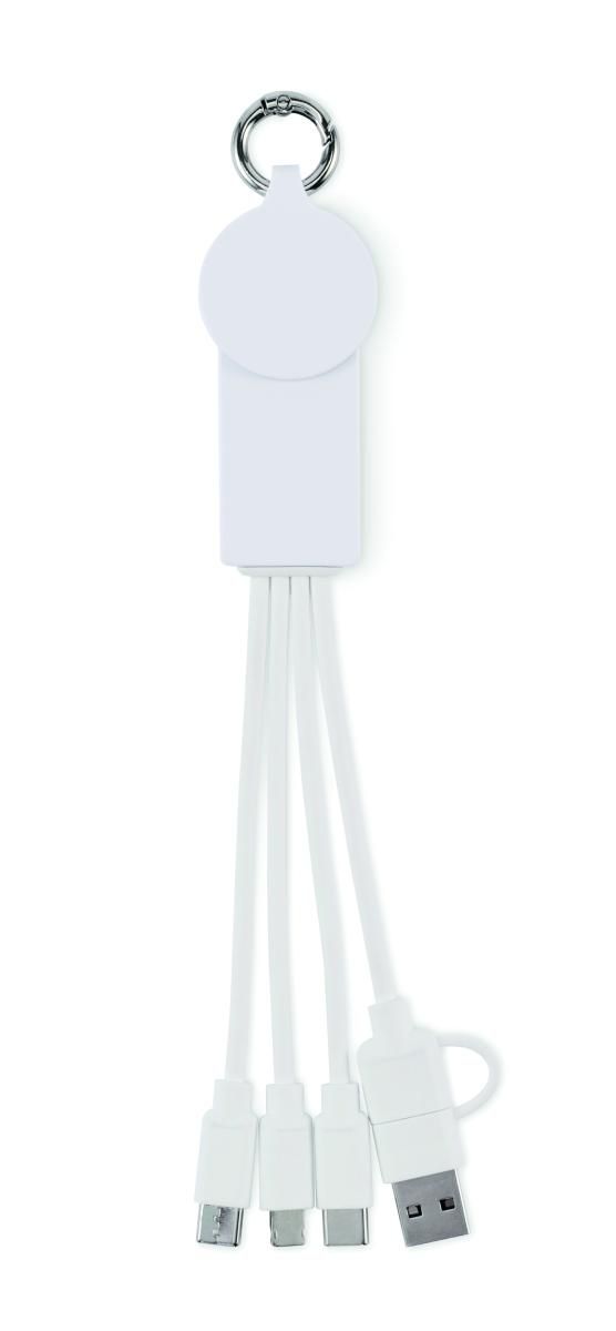 Llavero con cable de carga con entrada: 2 en 1 tipo-C y tipo-A. Salida: Carga de reloj (Samsung® y Apple®), 2 x tipo-C y micro-B (2 en 1 clavija). Cable de TPE reciclado.