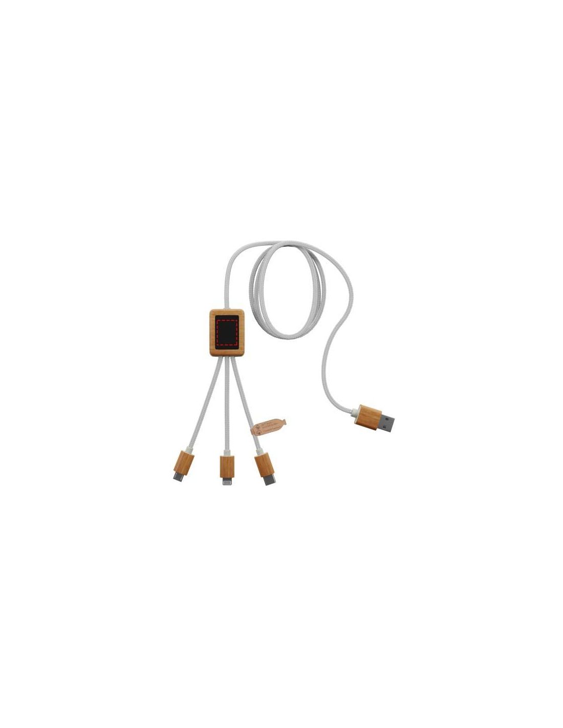 Cable de carga 3 en 1 de PET reciclado con logotipo retroiluminado y estuche cuadrado fabricado en bambú y plástico ABS reciclado. El logotipo retroiluminado es visible por ambos lados. Cuenta con tres conectores (tipo C, micro-USB, iPhone). Se pueden cargar hasta tres dispositivos simultáneamente gracias a una salida de carga rápida de 2 A. Se entrega en una funda de algodón (20 x 8 cm), con una tarjeta de papel kraft. Longitud del cable: 1 metro. Incluye una garantía de tres años.