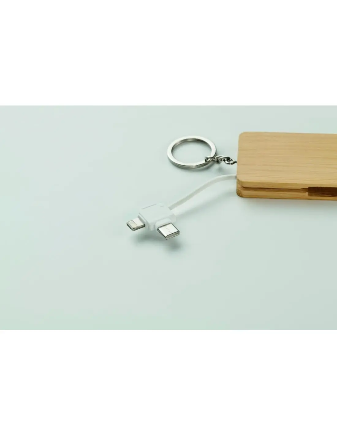 Llavero con carcasa de bambú y cables de carga. Entrada: 2 en 1 Tipo-C y Tipo-A. Salida: Tipo-C y micro-B (2 en 1 pin).