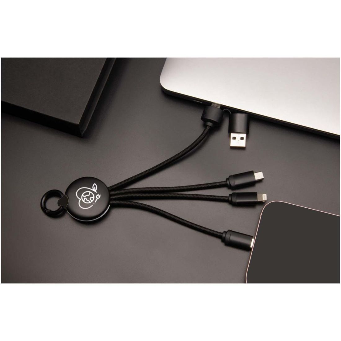 Cable de carga 5 en 1 con 3 conectores (tipo C, Android, iPhone) y cables de rPET (fabricados a partir de botellas de plástico recicladas). Gracias a su doble entrada USB-A y USB-C, es 100 % compatible con los ordenadores más recientes del mercado (USB-C). Acabado metálico en las tapas de los extremos. El cable puede cargar hasta 3 dispositivos simultáneamente. Se entrega con una funda reciclable y una tarjeta de papel reciclado.