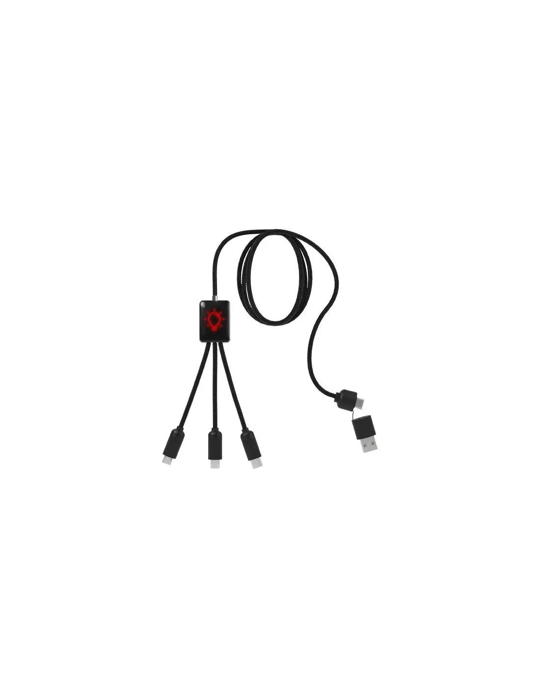 Cable de carga con acabado de caucho y metal y logotipo luminoso. Equipado con tres conectores (tipo C, Android, iPhone) y salida USB A y USB C. Se pueden cargar hasta tres dispositivos...