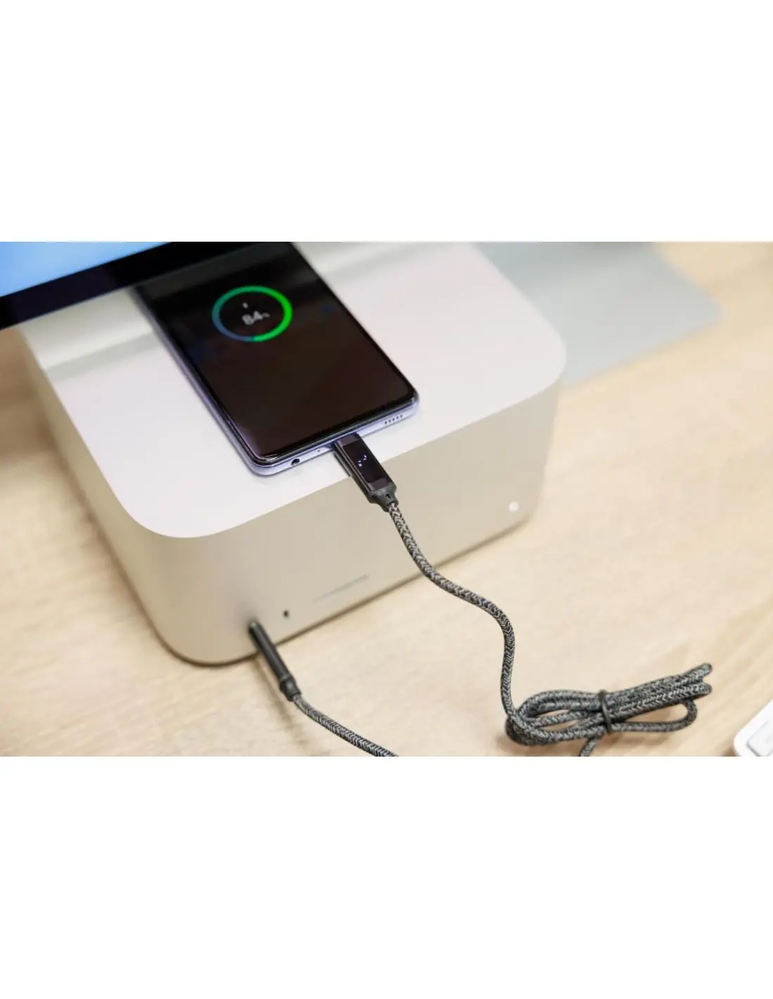 Cable de carga de nailon con enchufes de aluminio. Longitud: 1 metro. USB-C a USB-C. Capacidad: 100 W. Luz azul de indicación de carga. Velocidad d…
