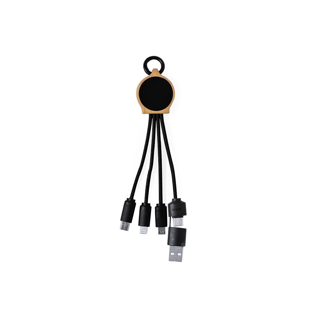 Cable cargador fabricado en bambú y superficie en elegante color negro, con luz led interior y un recubrimiento exterior especialmente diseñado para marcaje en láser, iluminando así el logotipo. Con conexiones de entrada Tipo C y USB y salidas Tipo C, Lightning y Micro USB. 5V DC 2.4A. Presentado en bolsa individual de diseño kraft.