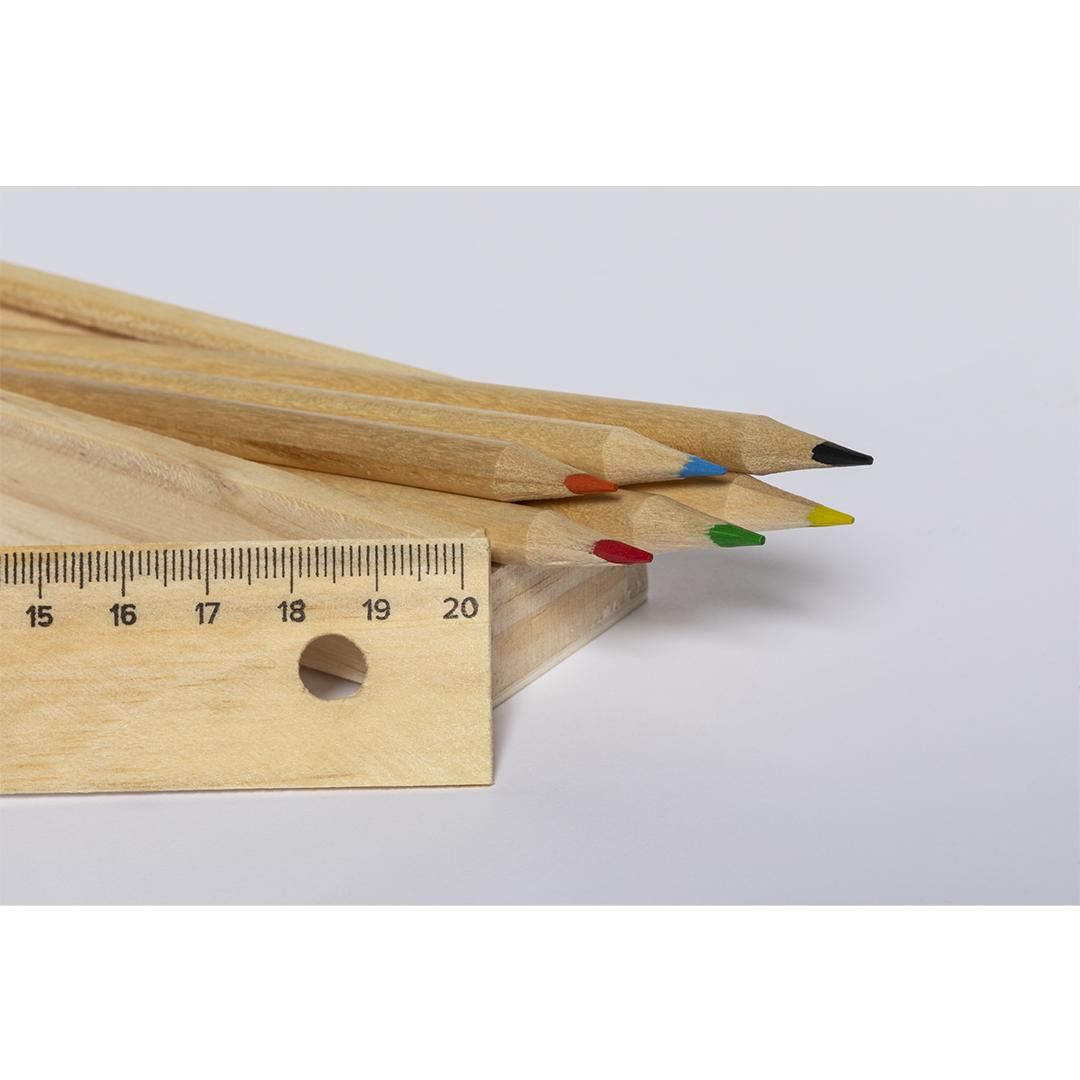 Set de 6 lápices en estuche de madera natural. Lápices en madera, con cuerpo redondo de acabado natural y minas en colores variada gama de vivos colores. Tapa de cierre anti deslizante con regla integrada de 20cm.