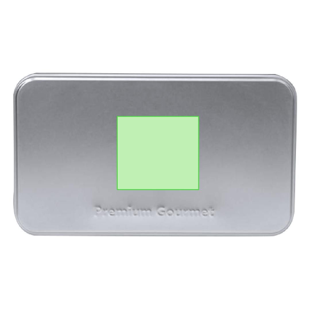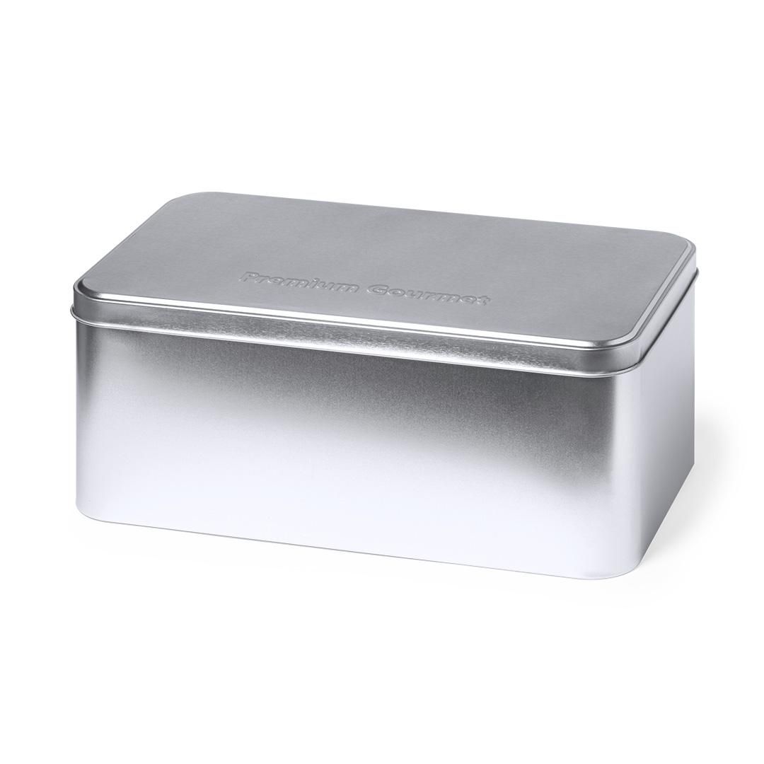 Caja de presentación formato rectangular, fabricada en resistente metal de acabado plateado y con tapa a juego.