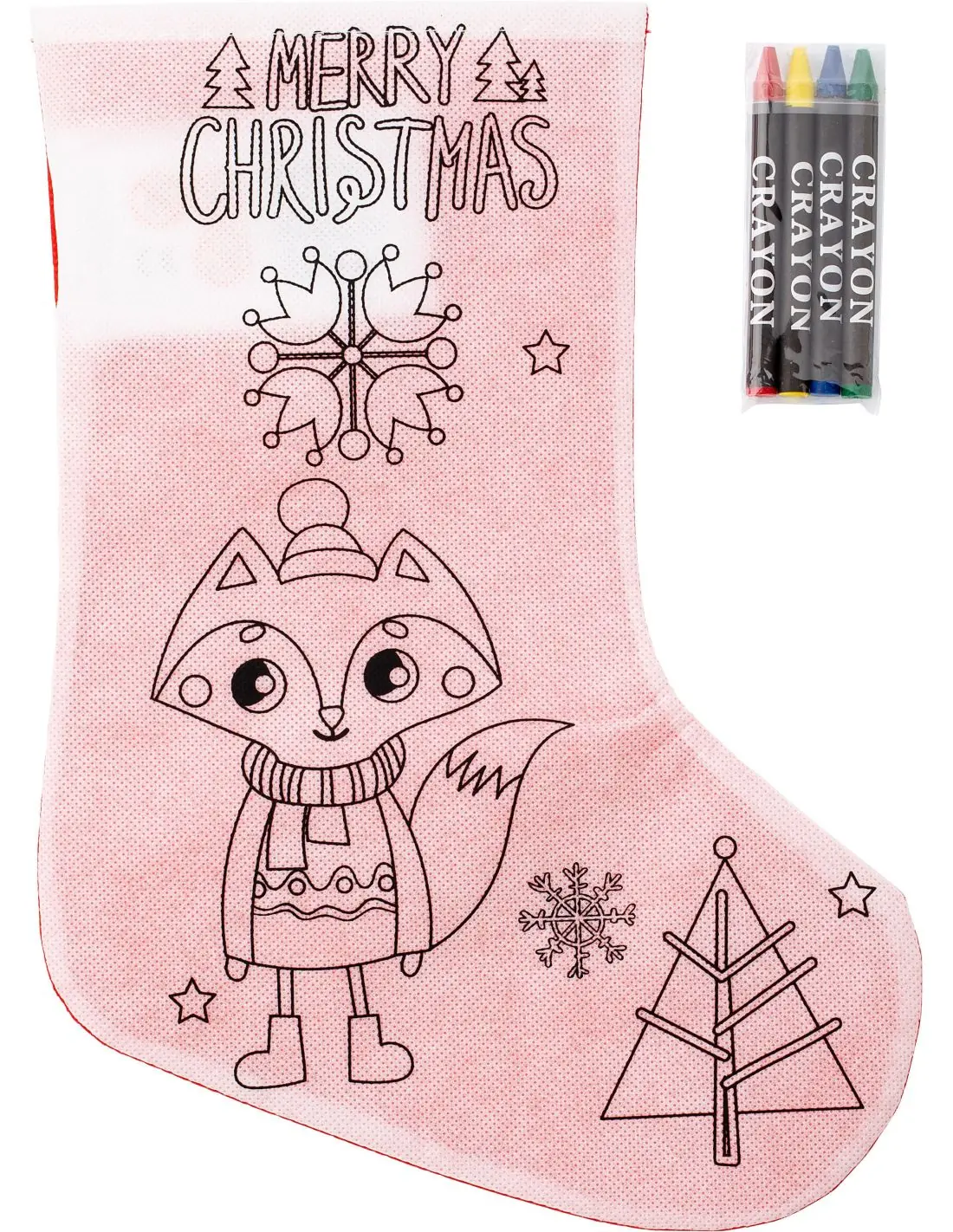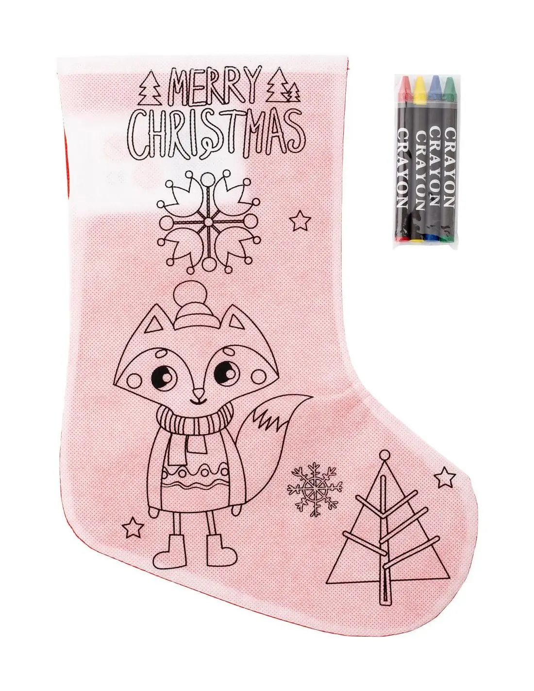 Calcetín navideño de nonwoven (80gr / m²): rojo en un lado y en el otro impresión para colorear. Incluye 4 ceras (verde, rojo, amarillo y azul).