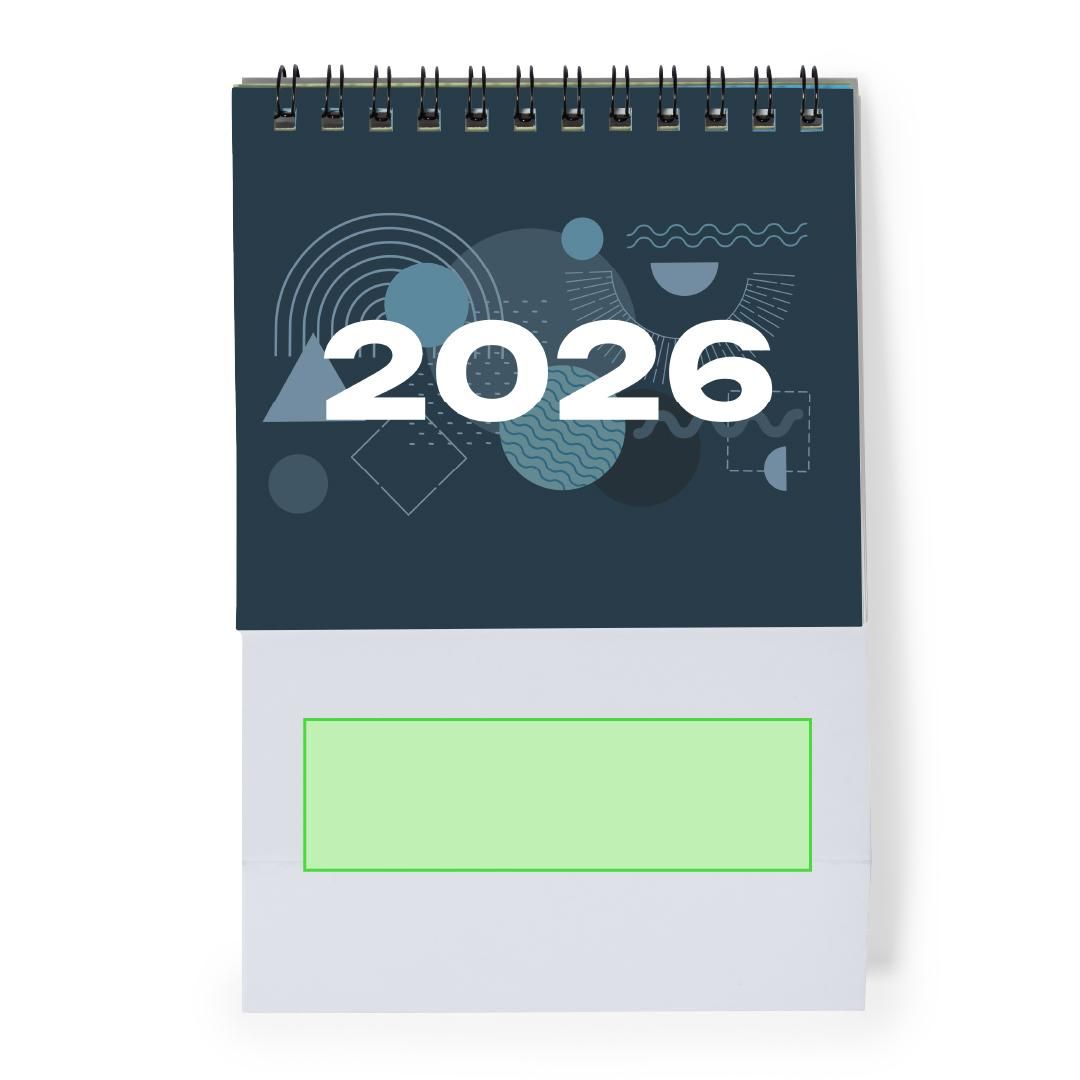 Calendario de sobremesa de anillas con cuerpo triangular en cartón. Diseño mes en curso/ mes anterior/ mes siguiente y santoral. Amplia superficie de marcaje en ambas caras.