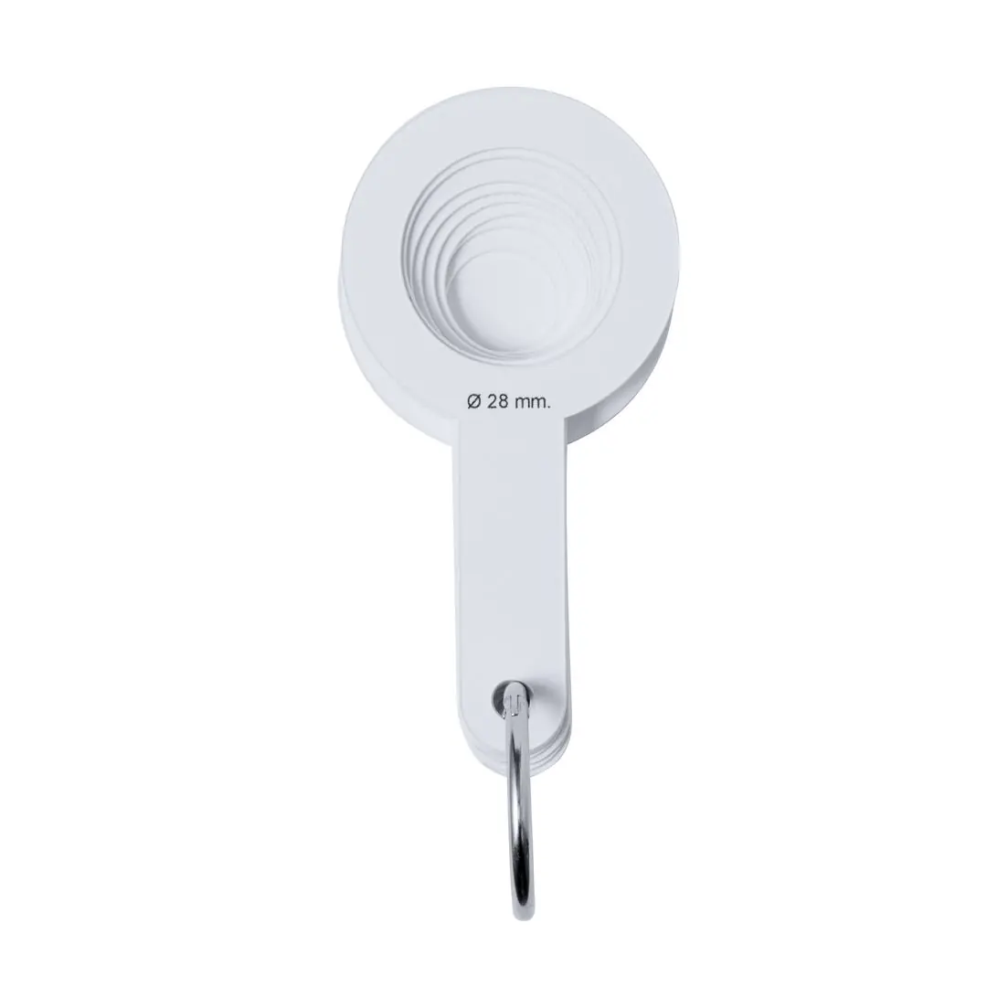 Calibrador manual fabricado en resistente PP. Para diá metros desde 14mm hasta 28mm, perfecto para la medición y clasificación a tiempo real y según tamaños. Cuenta con 8 plantillas que van aumentando gradualmente cada 2mm, una de ellas con superficie plana para marcaje. Unidos por una práctica anilla de transporte.