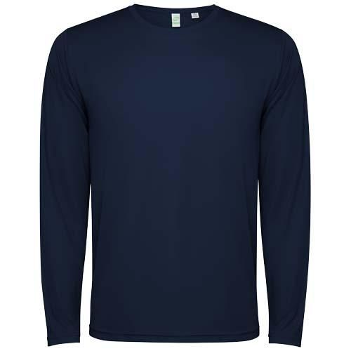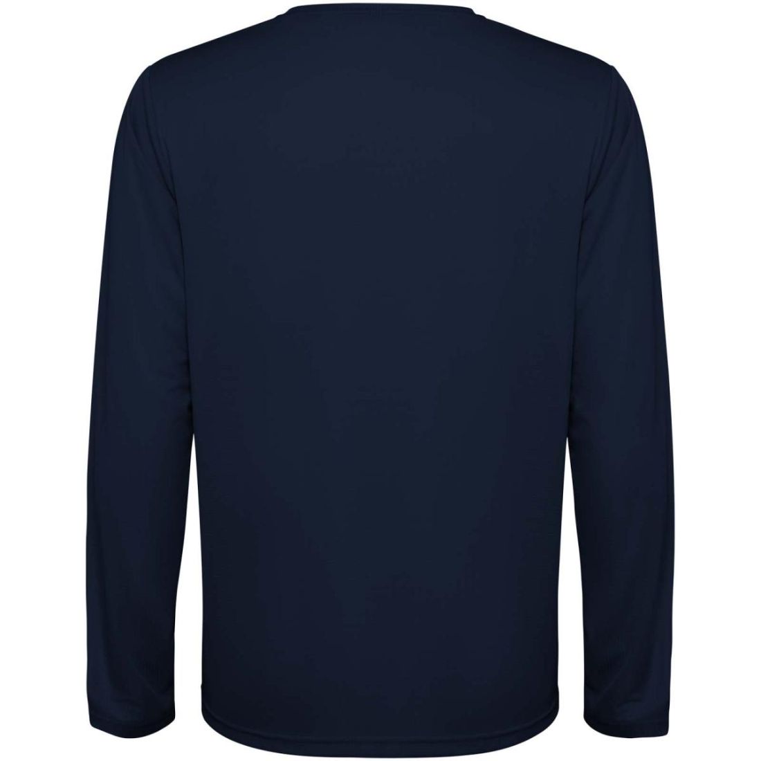 Camiseta técnica de manga larga infantil. Cuello con costuras a juego. Dobladillo trasero ligeramente más largo que el delantero. Costuras laterales desplazadas hacia delante.