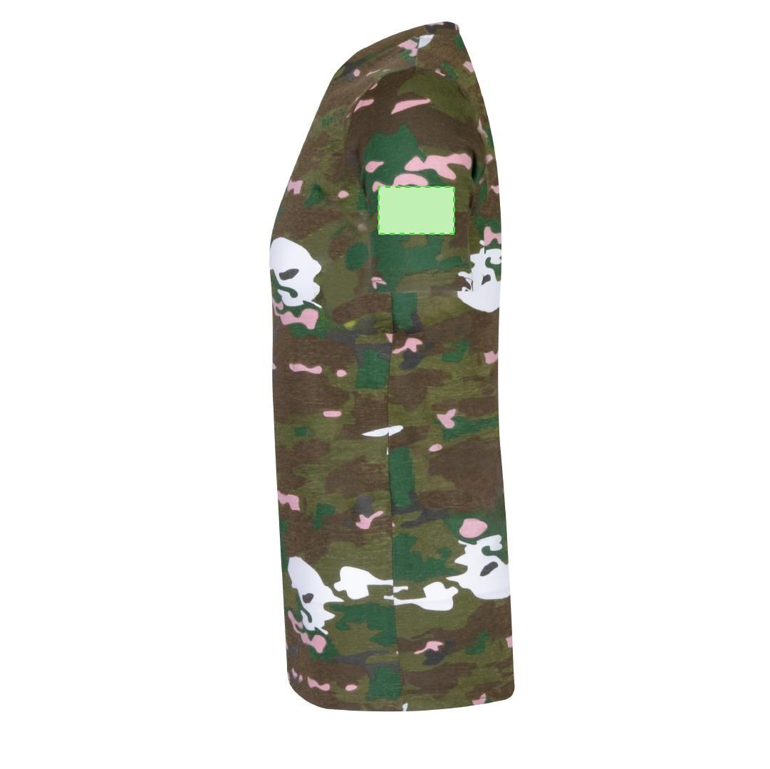 Camiseta unisex con estampado camuflaje. Confeccionada en 100% algodón peinado Ring Spun de 150g/m2. Tacto suave y corte moderno. Cuello redondo estrecho en canalé 2x2. Dobles costura en dobladillo y mangas para una mayor durabilidad y resistencia al uso intensivo. Etiqueta fácilmente removible. Disponible en tallas XS, S, M, L, XL y XXL.