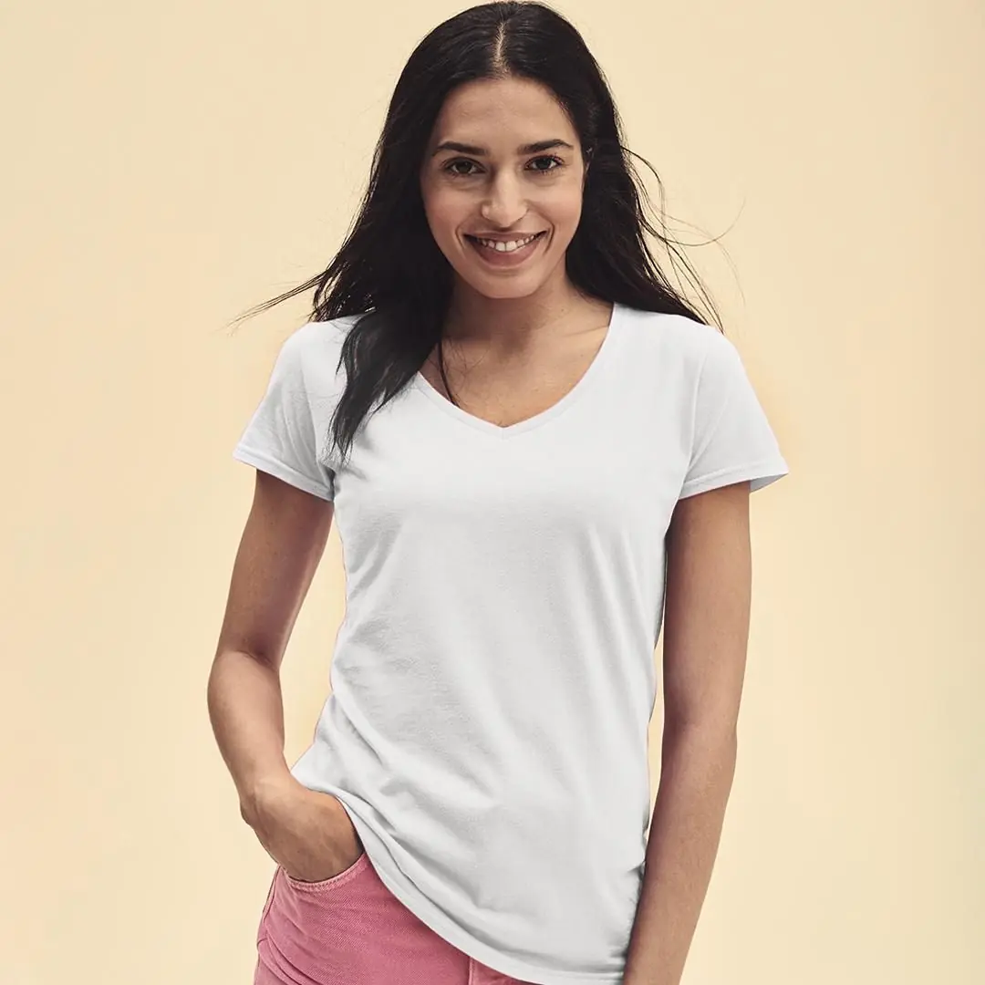 Camiseta para mujer blanca Iconic V-Neck de Fruit Of The Loom. Fabricada en material 100% algodón peinado Ring Spun de 140g/m2 hilado en anillo. De...
