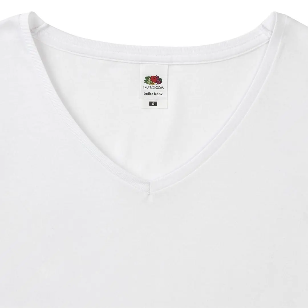Camiseta para mujer blanca Iconic V-Neck de Fruit Of The Loom. Fabricada en material 100% algodón peinado Ring Spun de 140g/m2 hilado en anillo. De tacto suave y corte entallado, con costuras laterales diseñadas para un ajuste perfecto. Con cuello en pico estrecho de canalé 1x1 y tapeta a juego. Etiqueta fácilmente removible y disponible en tallas XS, S, M, L, XL, XXL.