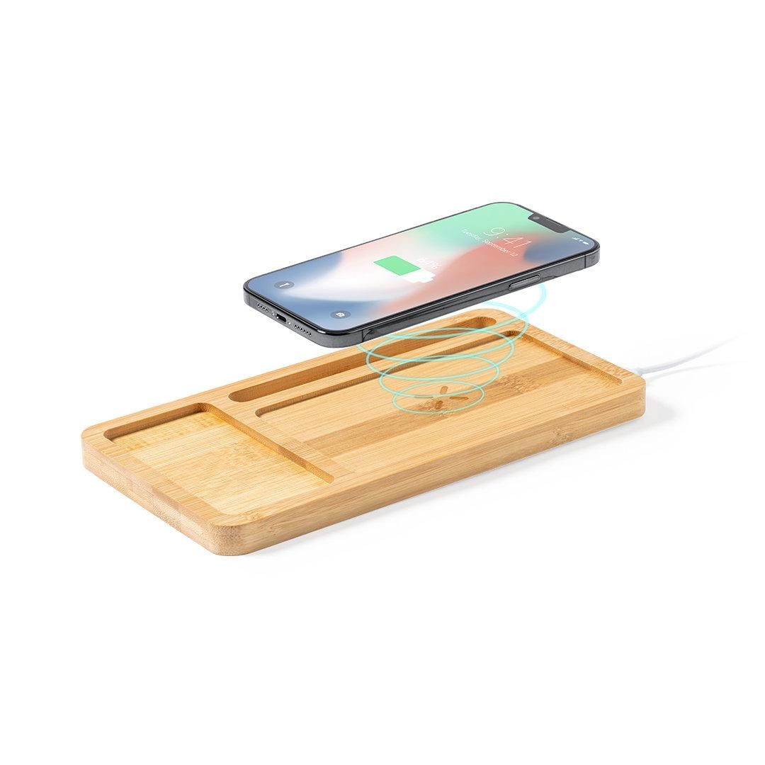 Cargador organizador inalámbrico 15W de línea nature. Con función soporte para smartphone y compartimento extra para objetos. Salida USB de 2.000 mA. Permite cargar de manera simultánea hasta 2 dispositivos (1 mediante carga inalámbrica y 1 mediante cable). Hecho en bambú procedente de cortes naturales y compatible con dispositivos equipados con tecnología de carga inalámbrica. Amplia superficie de marcaje y presentado en caja individual de diseño eco en cartón kraft.