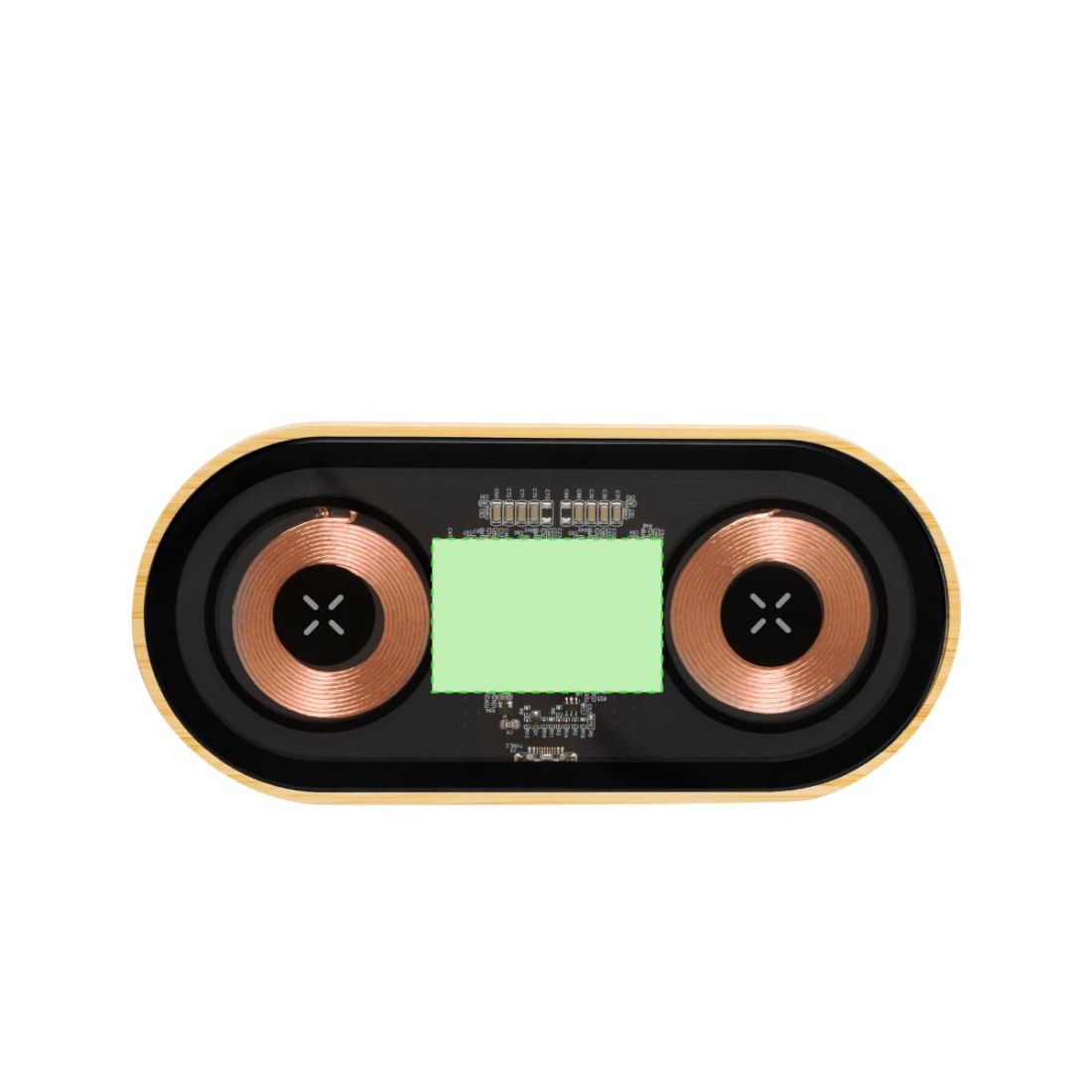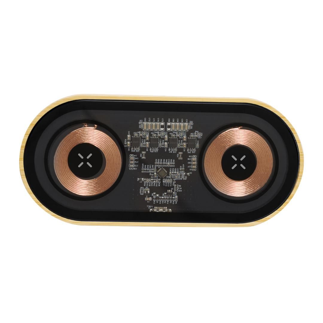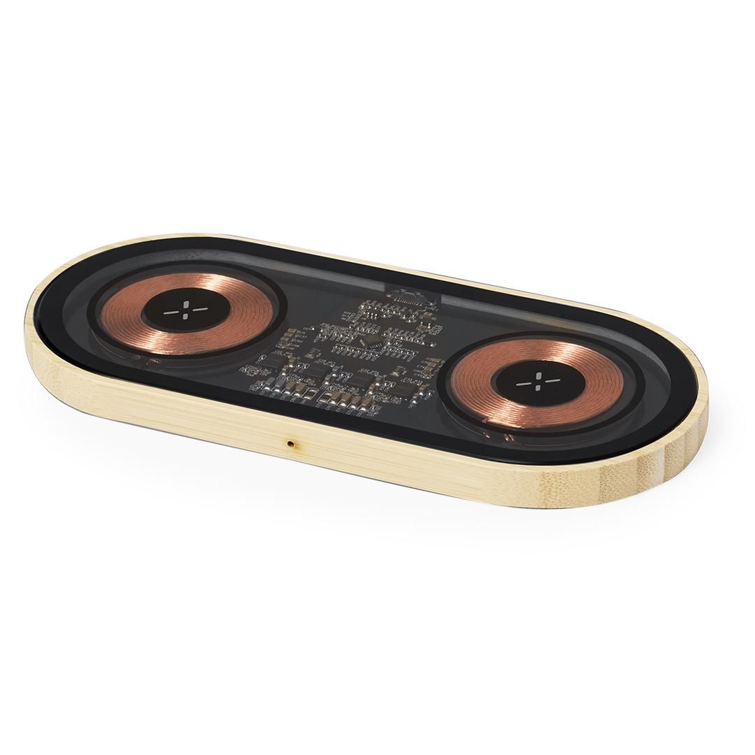 Cargador inalámbrico doble de 15W de original diseño y superficie transparente que permite ver los componentes internos del dispositivo. Con base de bambú, compatible con dispositivos con tecnología Qi, y que además permite cargar dos dispositivos simultáneamente. Conexión Tipo C, con instrucciones de uso en español e inglés. Presentado en caja individual de diseño kraft.Materiales como el bambú fomentan la utilización de materias primas naturales, reduciendo las emisiones contaminantes. Proviene de una planta de gran resistencia y versatilidad, con crecimiento y regeneración rápidos, siendo una excelente alternativa al uso de madera tradicional.Fabricado conforme a los estándares RoHS y en cumplimiento con los siguientes requisitos de seguridad:Sistema de protección contra sobrecalentamiento.Sistema de protección contra sobrecarga.Sistema de bloqueo para evitar cortocircuitos.