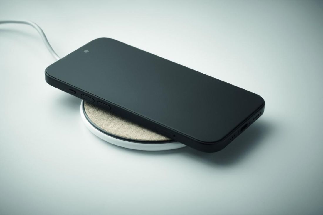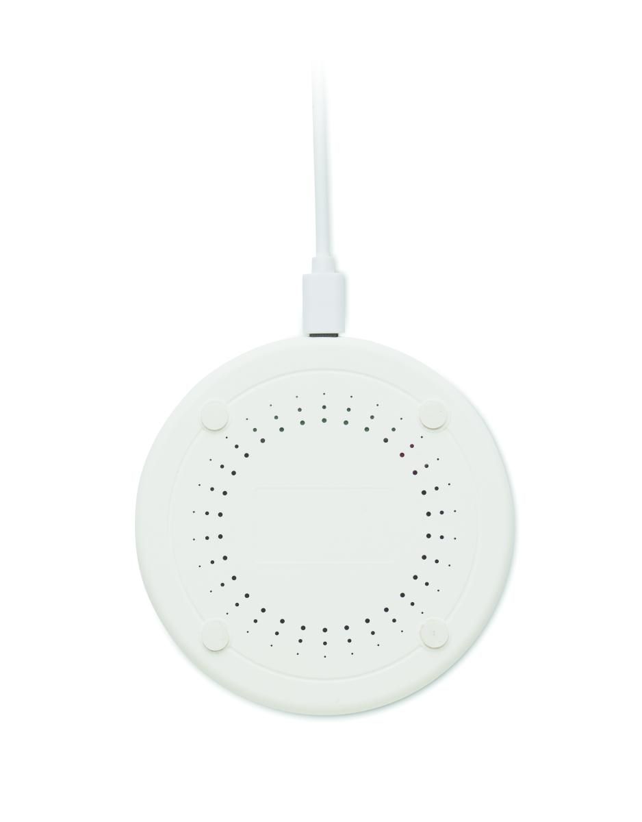 Cargador inalámbrico de ABS reciclado con detalles de algodón y corcho. Conéctalo a tu ordenador, coloca el teléfono sobre él y deja que se cargue. Salida: CC 9V/1,67A (15W).