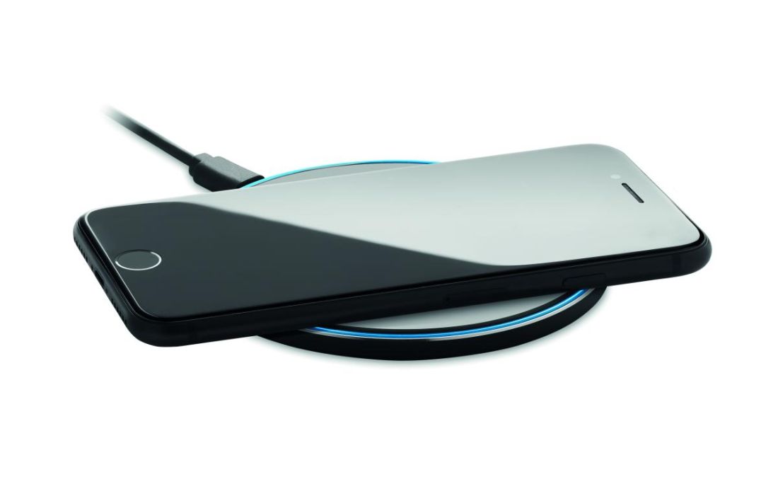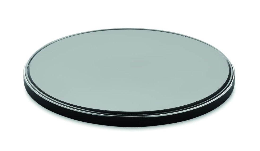 Base de carga inalámbrica de aluminio 10W con cristal en la parte superior. Indicador luz azul durante carga. Output: DC 9V/1.1A.