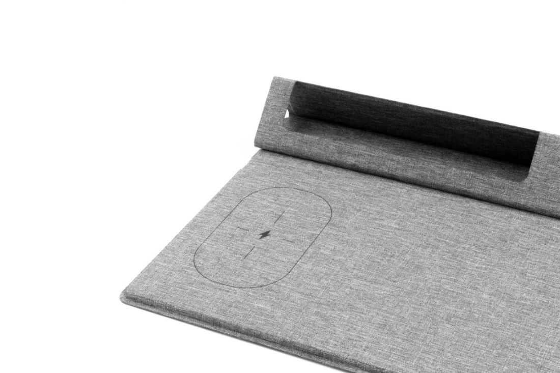 Fabricado a partir de botellas PET recicladas, esta herramienta multifuncional combina un cargador inalámbrico, una alfombrilla para ratón, un sopo…