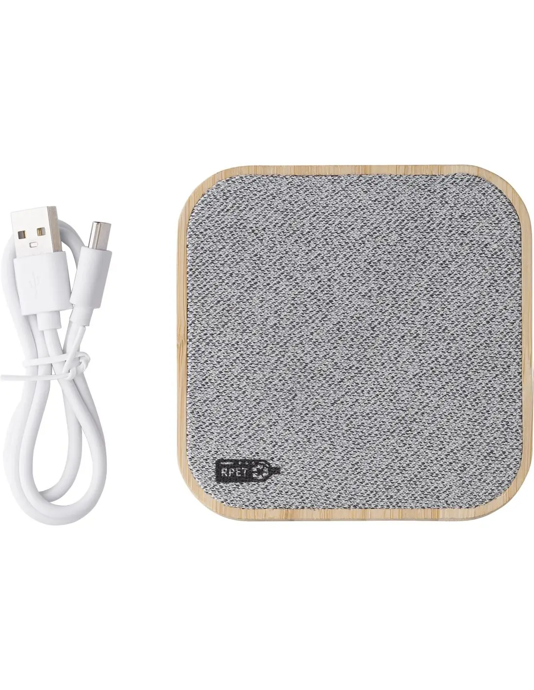 Cargador inalámbrico de bambú con detalles en rPET. Carga rápida 15W. Presentado en una caja de cartón marrón.