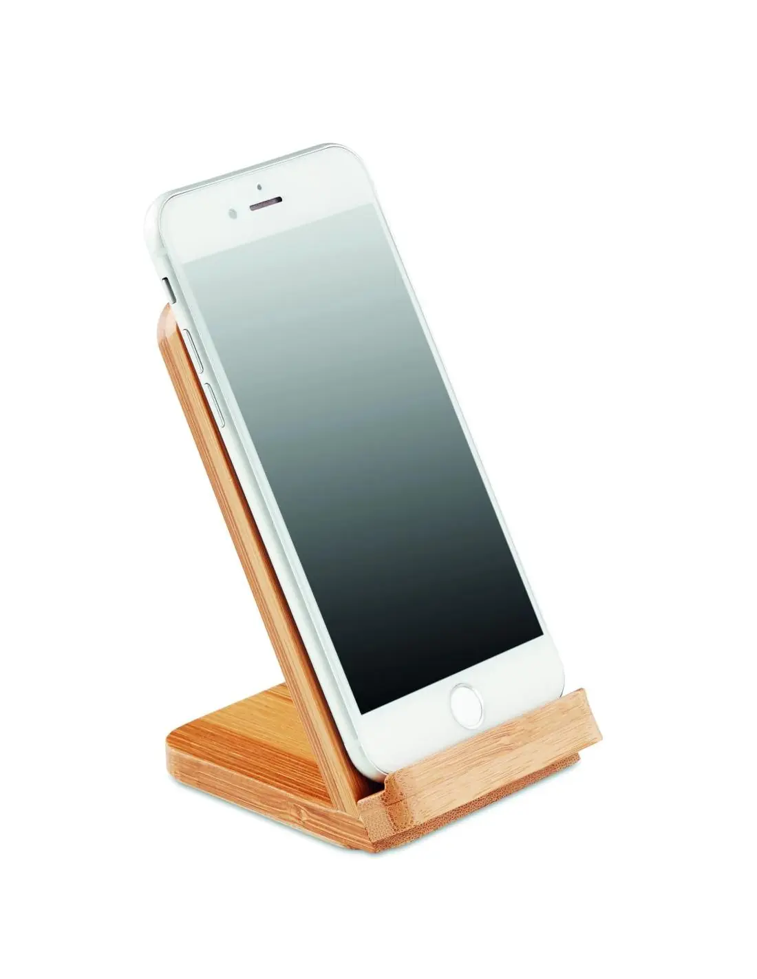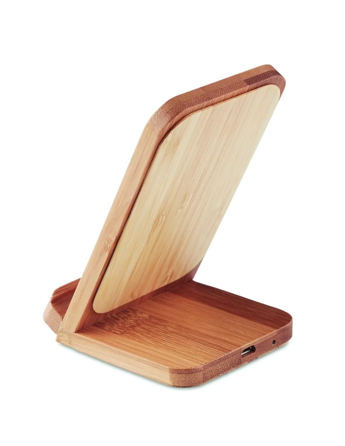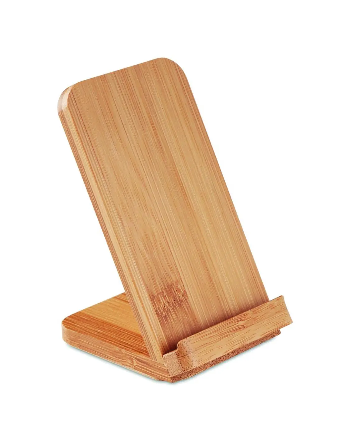 Cargador inalámbrico de doble bobina para 1 dispositivo en carcasa de bambú y con función de soporte. Coloque el smartphone sobre él para iniciar la carga. Salida: DC5V/1A (15W).