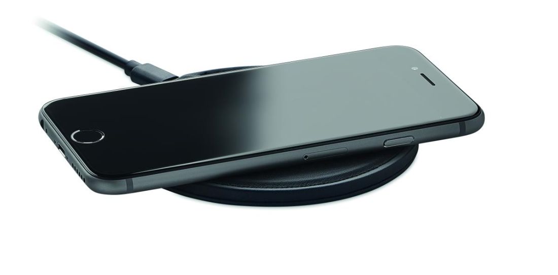 Cargador inalámbrico de PU reciclado. 58% reciclado (40% poliéster reciclado y 18% PU reciclado). Salida: DC 9V/1.67A (15W) para carga rápida.