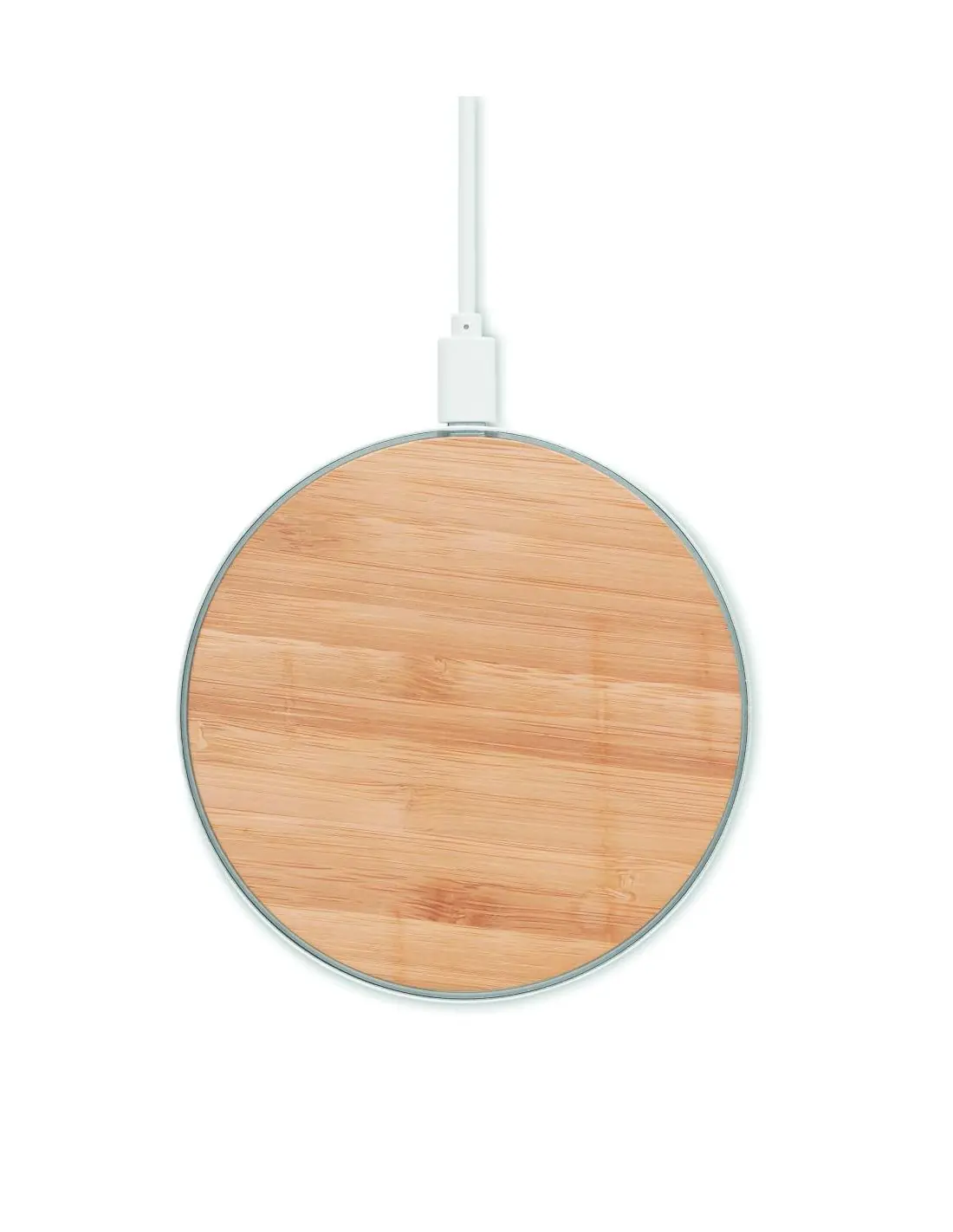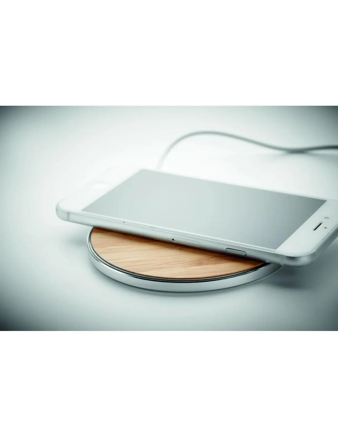 Cargador rápido inalámbrico en bambú y aluminio. Durante la carga se enciende el indicador de luz azul. Salida: DC9V/1.1A (10W). El bambú es un producto natural, puede haber ligeras variaciones en el color y el tamaño por artículo, lo que puede afect