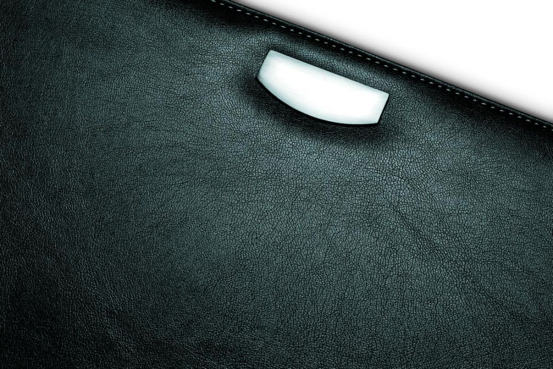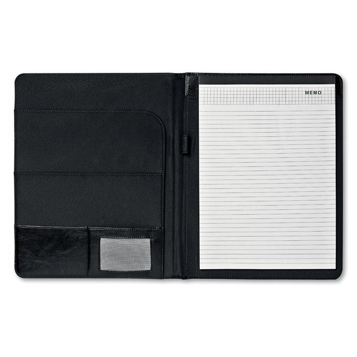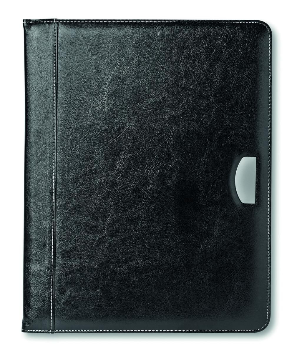Porta documentos A4 de material PU con placa de metal para el logo. Incluye bloc de notas de 20 hojas.