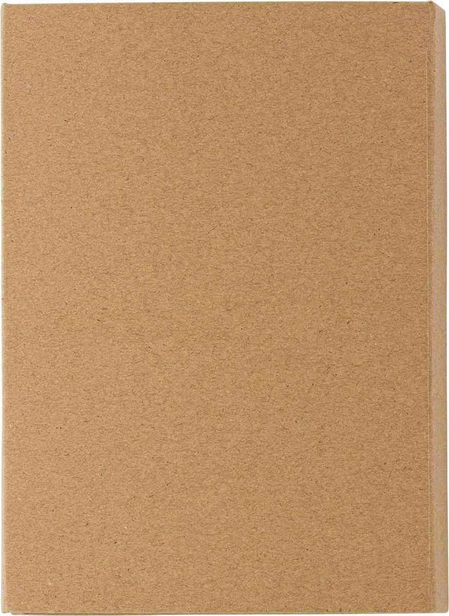 CarPETa de cartón con material de escritura: cuaderno de 40 hojas, regla de bambú (15 cm), bolígrafo de cartón con terminales de plástico (tinta azul), dos lápices, sacapuntas, goma de borrar, notas adhesivas (25 de cada color) y un bolsillo interior.