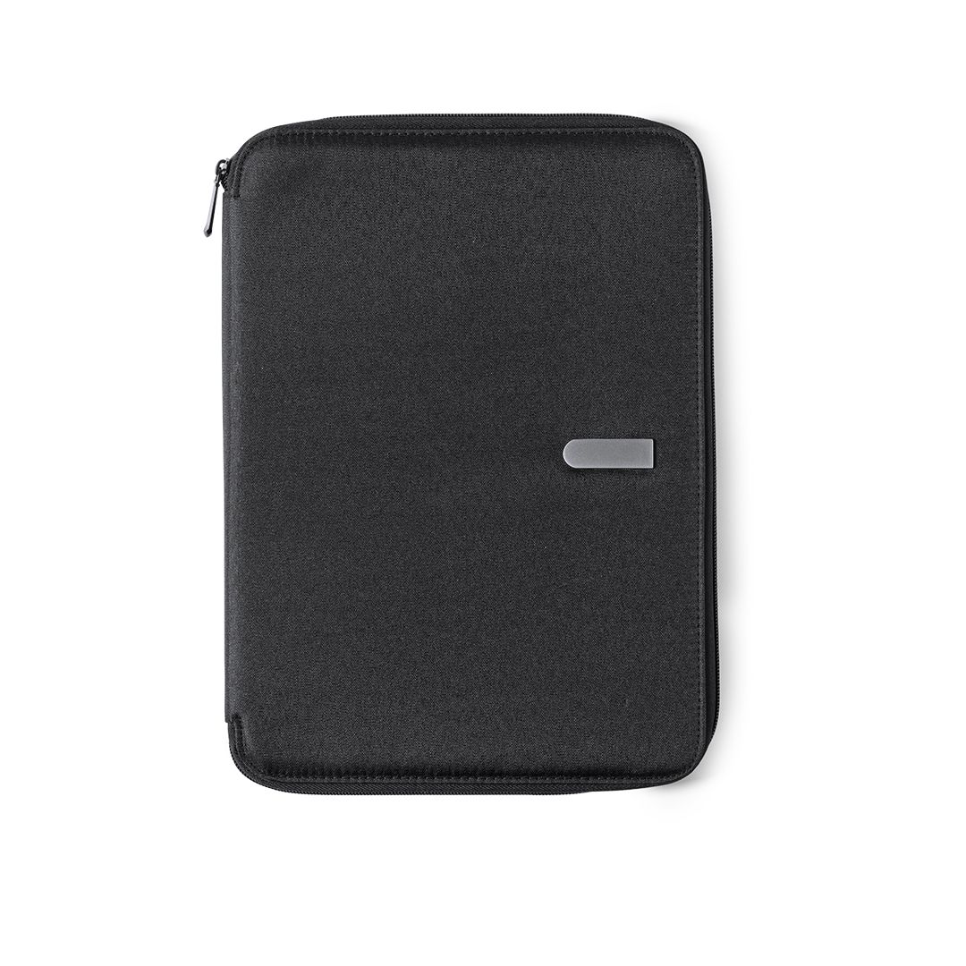 Elegante portadocumentos de cierre de cremallera acabado en suave microfibra. Interior con bloc extraíble de 20 hojas de distribución a una raya, bosillo de cremallera, bolsillo solapa, tarjeteros y soporte para bolígrafo. Con elegante chapa metálica en frontal para marcaje en láser.