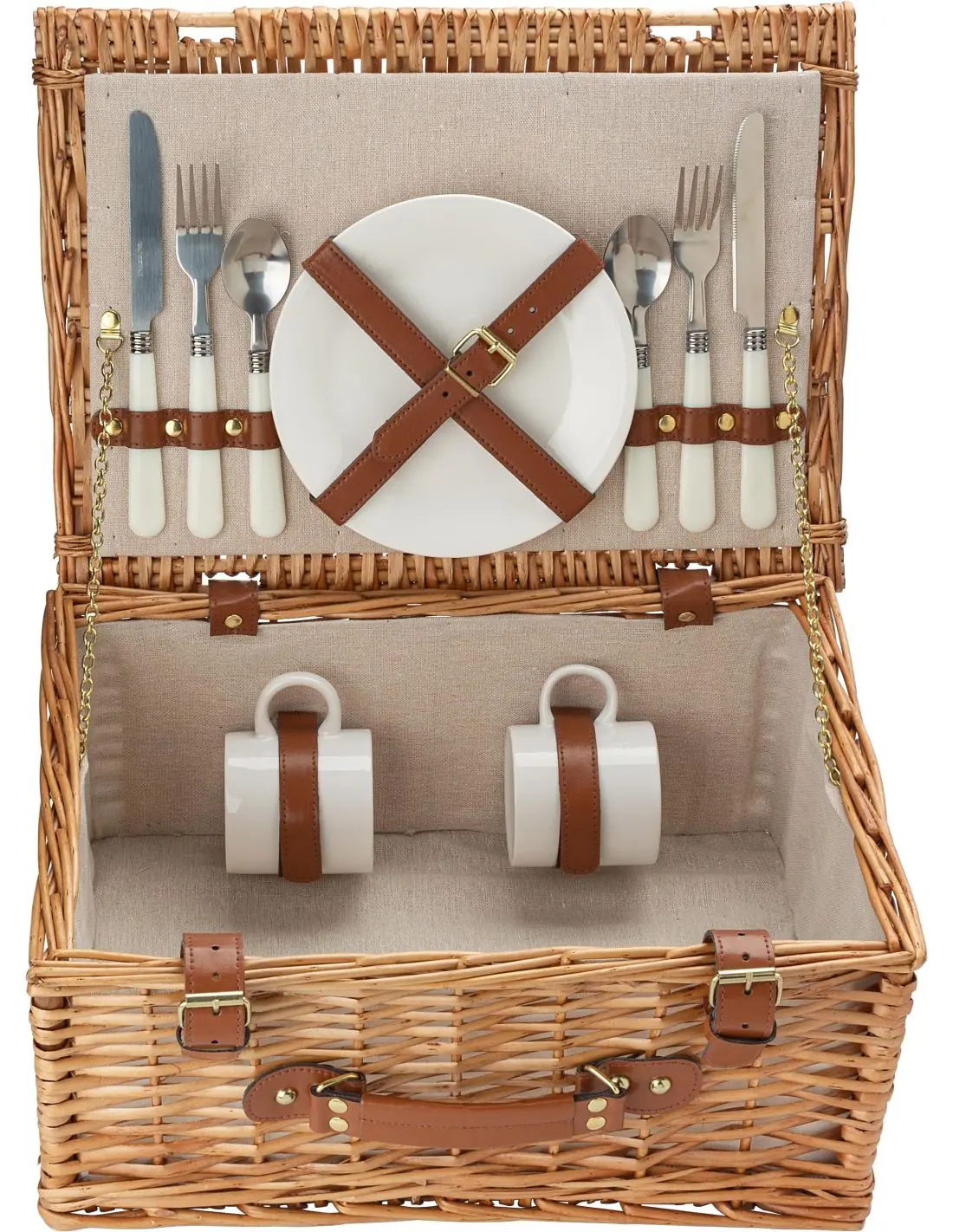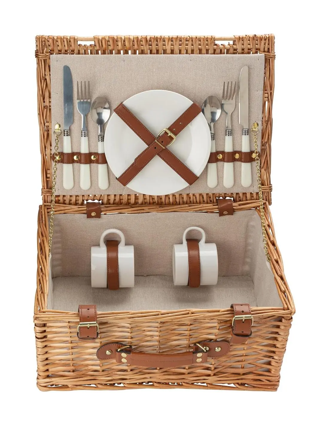 Cesta de picnic para 2 personas. Incluye cubiertos de acero inoxidable, platos y tazas (0,21ml) de cerámica. Producto hecho con materiales naturales, pueden haber diferencias en color y tamaño.