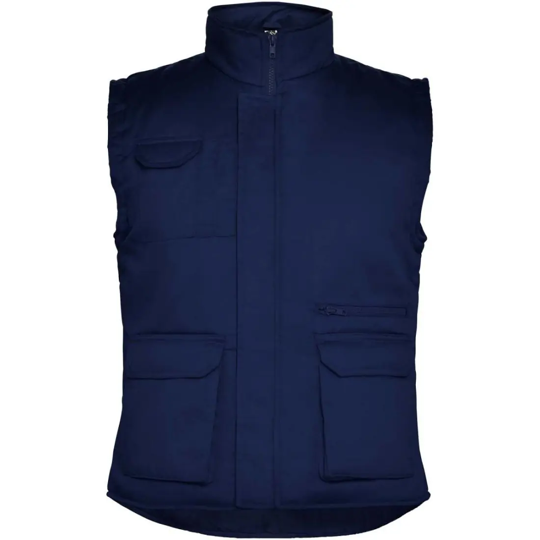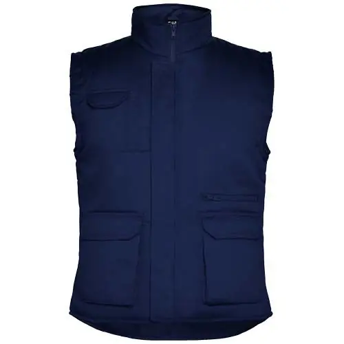 Chaleco de trabajo multiusos cálido con cuello alto. Cremallera frontal con correa y cierre de velcro. Bolsillo exterior para el teléfono en el lado derecho. Dos bolsillos delanteros con fuelle y aberturas laterales. Dos pequeños bolsillos para bolígrafos. Bolsillo interior con cierre de velcro. Bolsillo con cremallera. Parte trasera más larga. Ajustador con cierre automático.