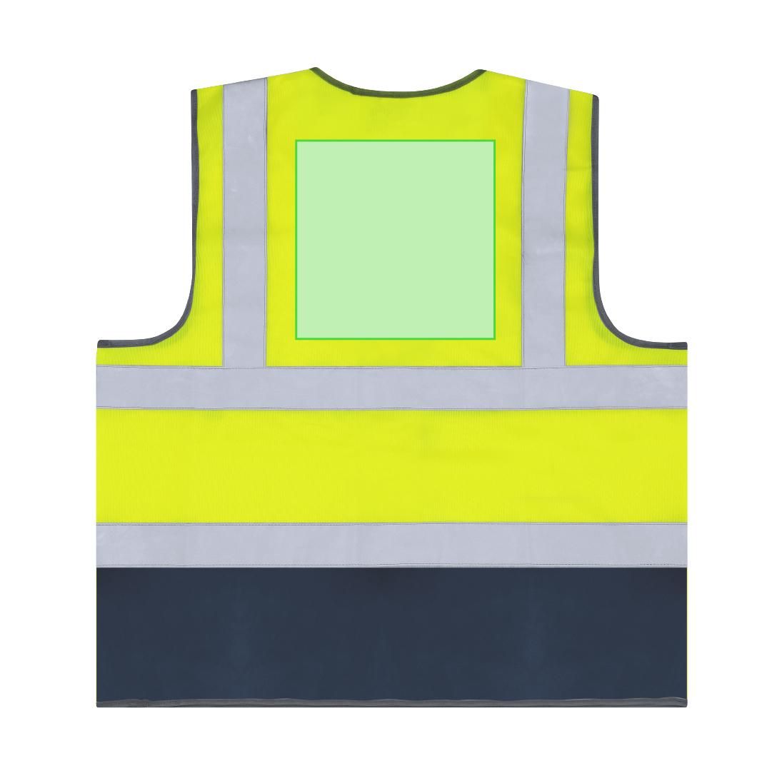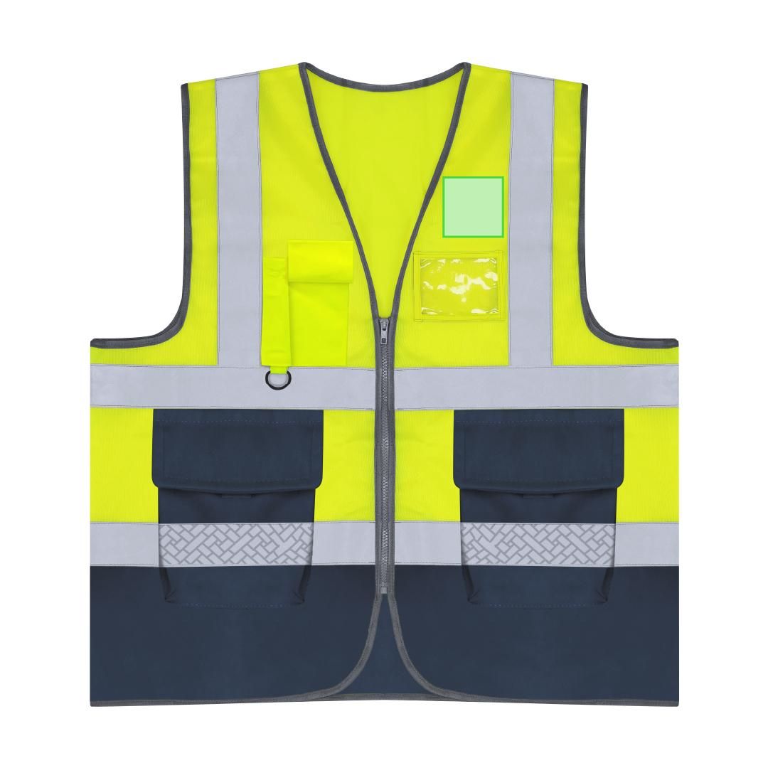 Chaleco de alta visibilidad con diseño bicolor. Incorpora dos bandas reflectantes horizontales en el cuerpo y dos adicionales en los hombros, mejorando la visibilidad en condiciones de baja luminosidad.Cuenta con cierre frontal de cremallera y varios bolsillos funcionales:- Dos bolsillos frontales laterales (16 x 18,5 cm)- Bolsillo superior derecho con cierre de velcro (6,5 x 15 cm)- Compartimento para tarjeta identificativa (10,5 x 8 cm)-Anilla plástica en el bolsillo superior, ideal para enganchar llaves o accesorios