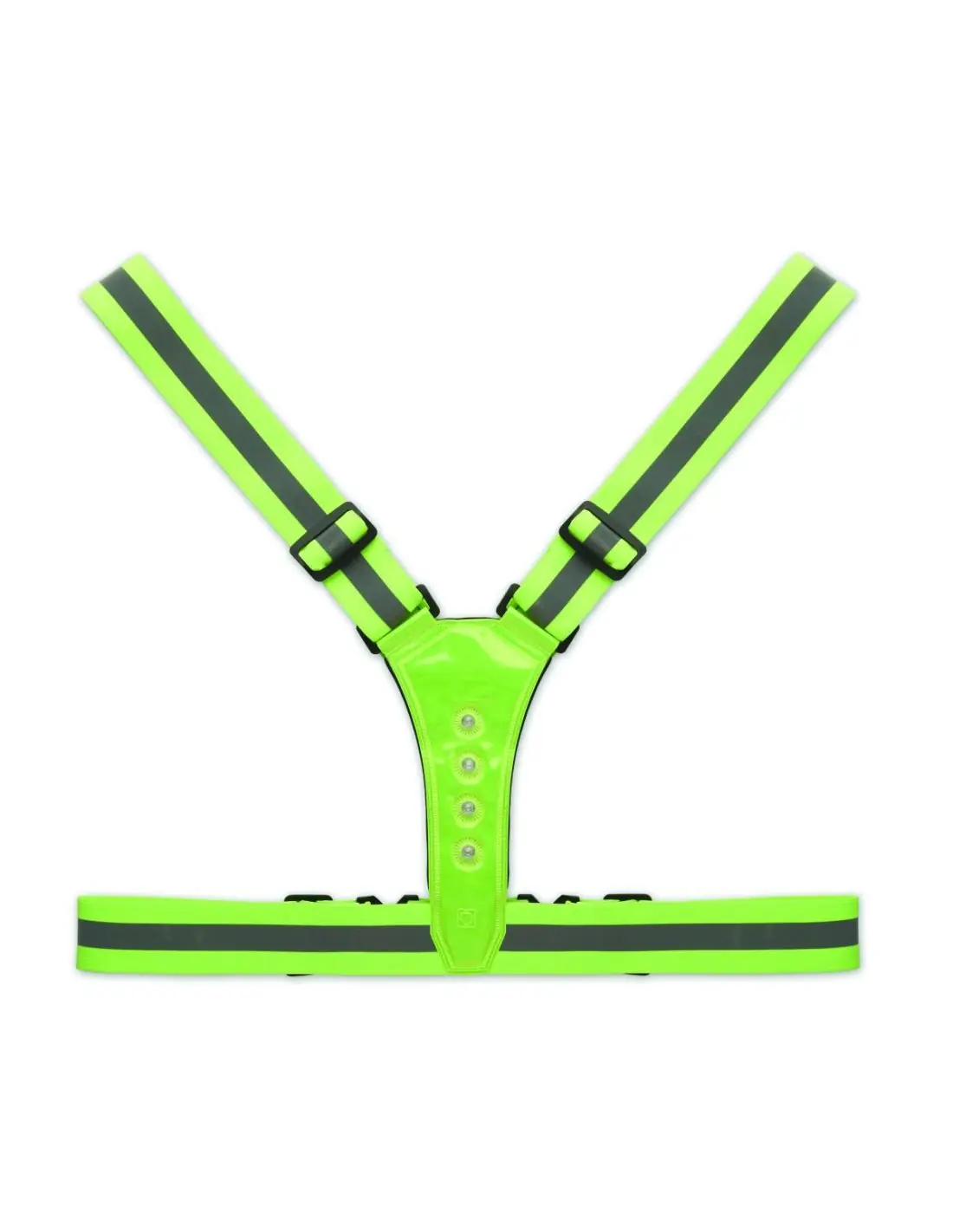 Chaleco reflectante ajustable 360° con 4 LED en la parte delantera y 4 LED en la parte trasera y bandas plateadas. Incluye 2 pilas CR2032. Sólo para uso promocional.