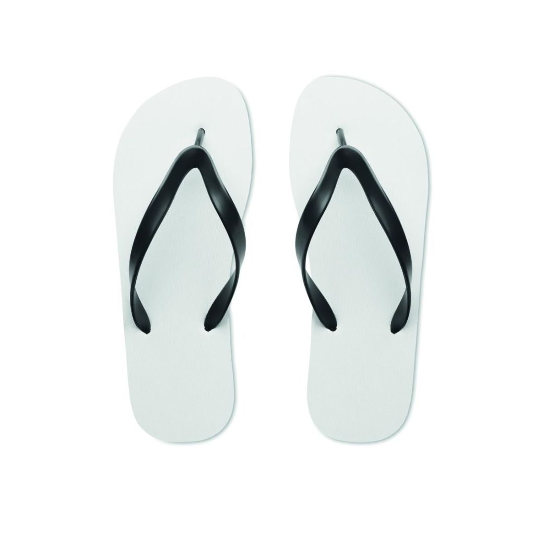 Chanclas de playa para sublimación con tiras en PVC. Suela de goma con capa superior de poliéster. Talla 42-44. Este artículo únicamente puede pedirse marcado.