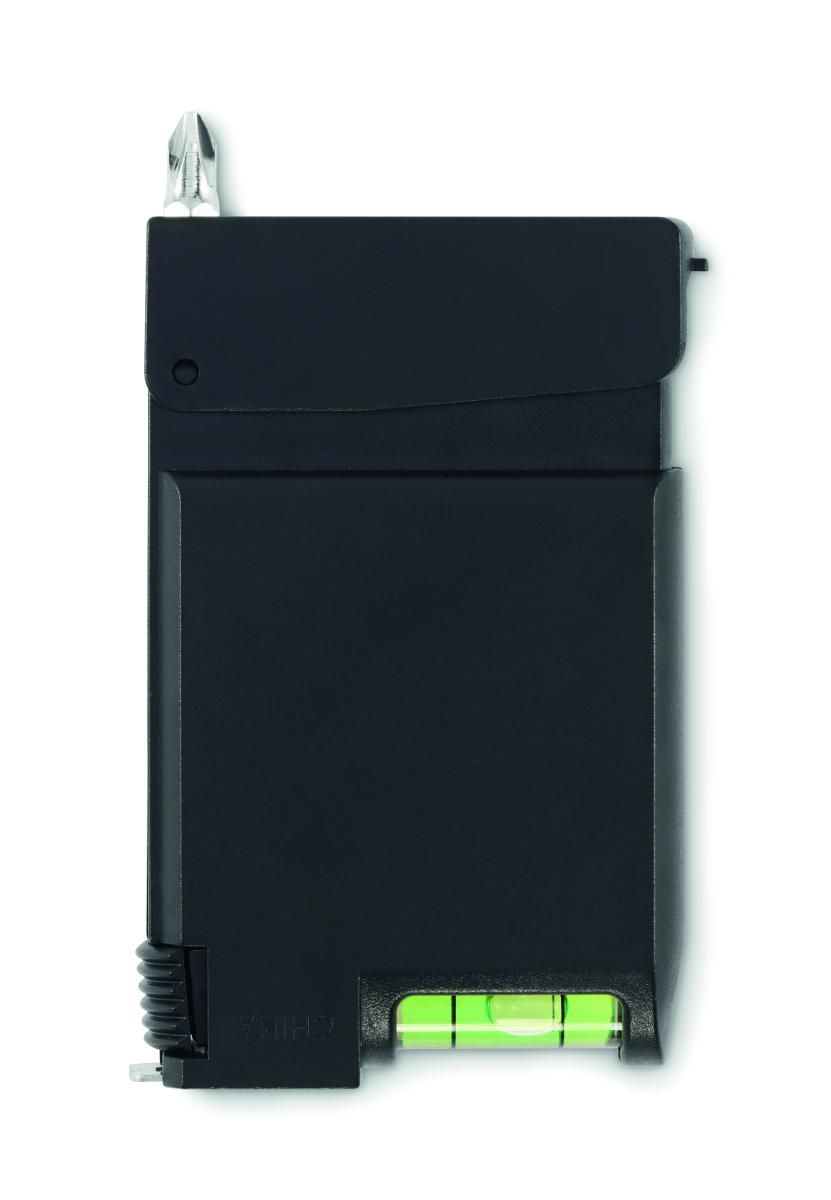 Cinta métrica multifuncional de 3M en ABS con detalle de bambú, que incluye nivel de burbuja y juego de destornilladores de 5 puntas.