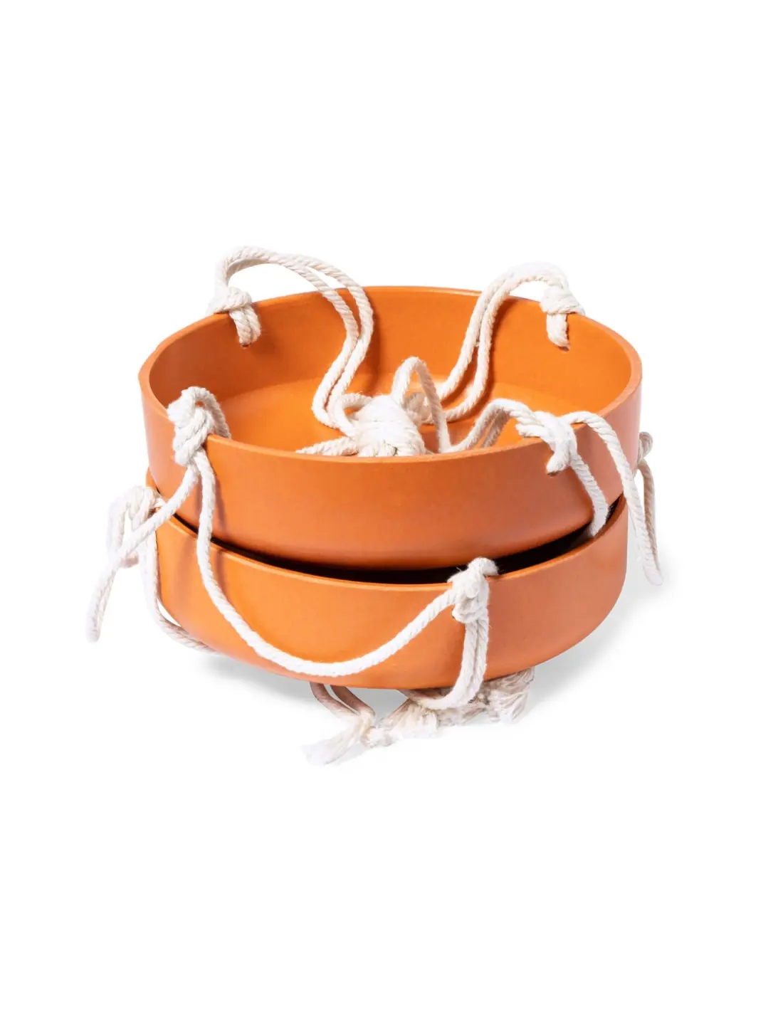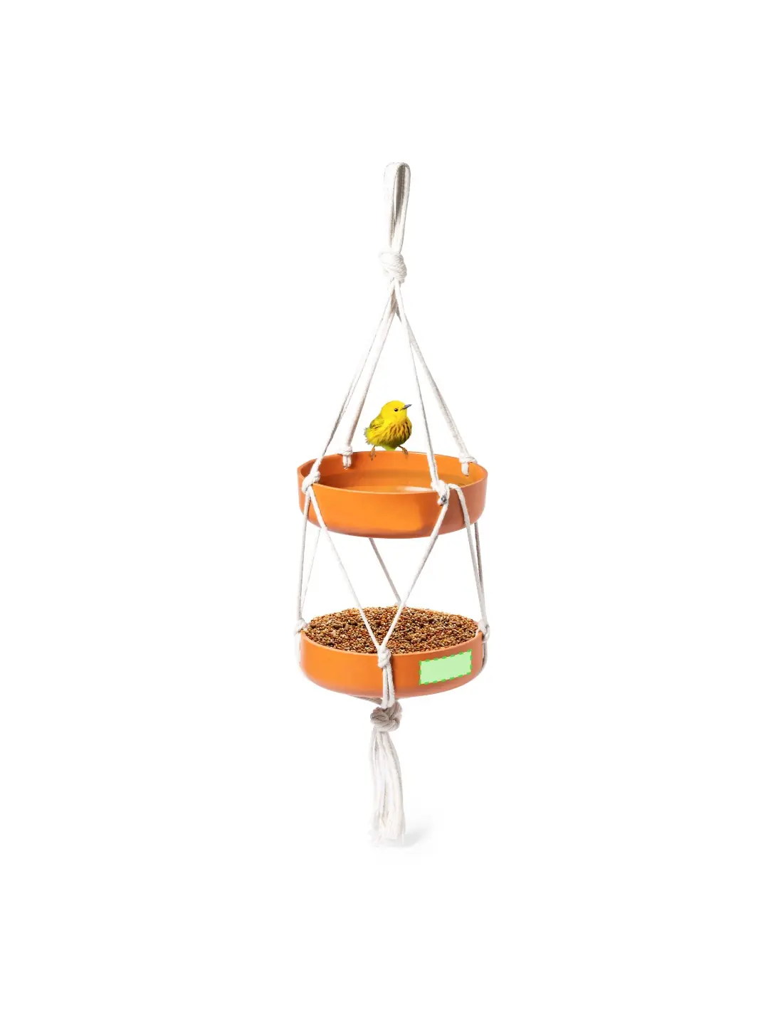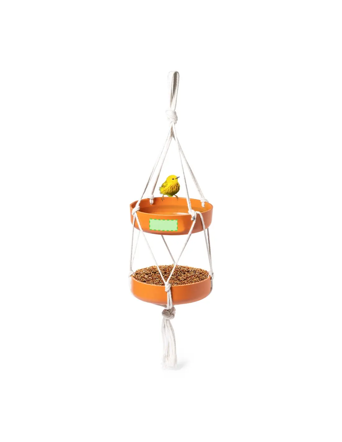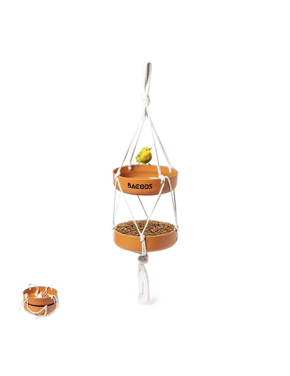 Comedero colgante para pájaro. Con dos recipientes fabricados en fibra de bambú (medidas 15 x 4 cm cada uno) y resistente cuerda de algodón natural. Presentación en caja individual de diseño kraft.