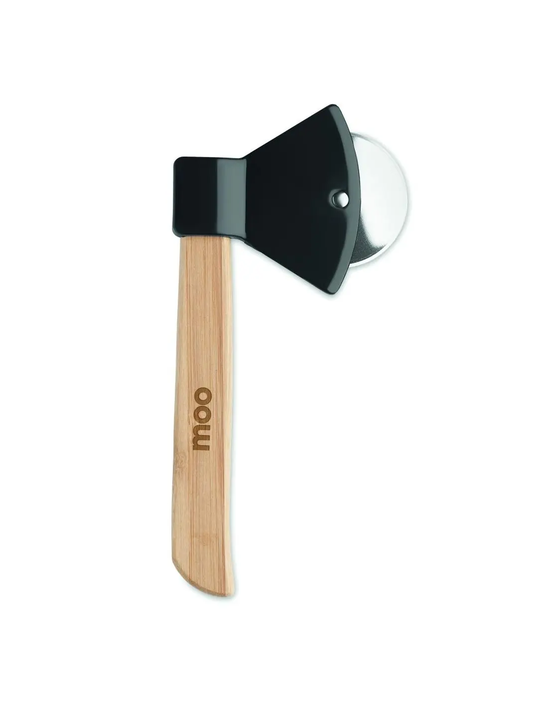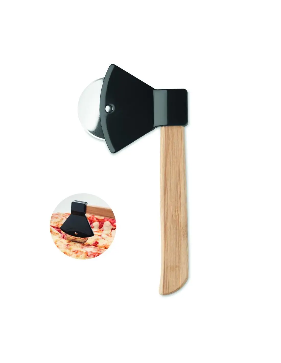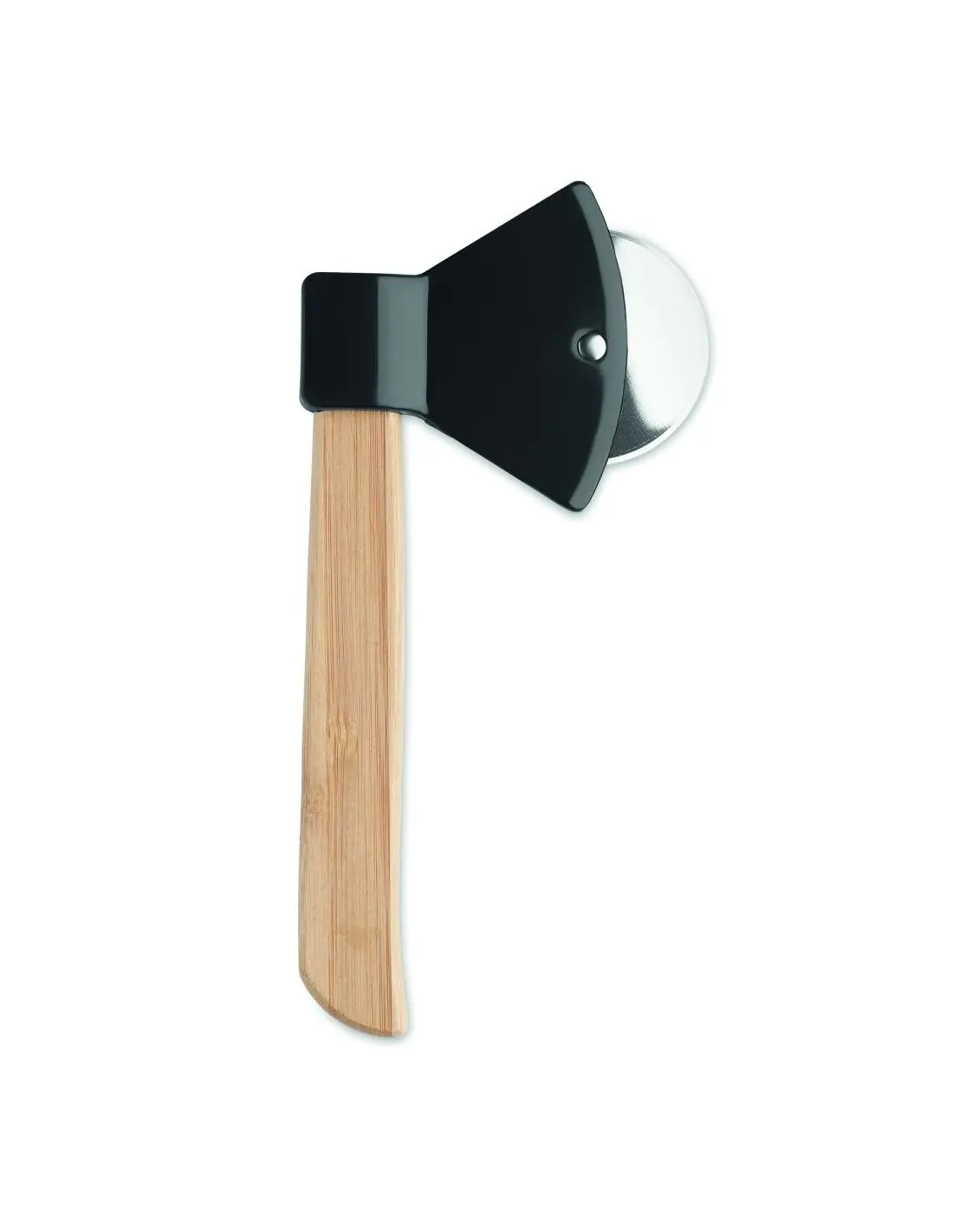 Cortador de pizza en forma de hacha con mango de bambú. El bambú es material natural, el color del articulo puede variar.