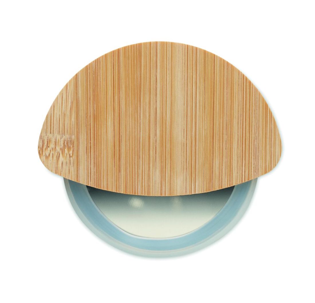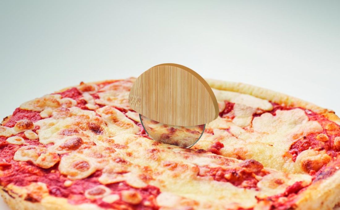 Cortador de pizza redondo con mango de bambú y cuchilla de acero inoxidable. Con anillo protector de silicona blanca transparente.