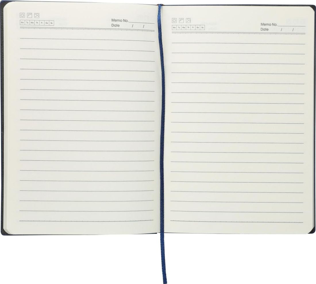 Libreta de PU reciclado (aprox. A5) con tapa dura y acabado imitación pana en la parte superior de la parte delantera y trasera. Incluye una cinta marcapáginas y 100 páginas rayadas de papel de 80 g/m². Presenta un logotipo reciclado en relieve en la parte trasera.