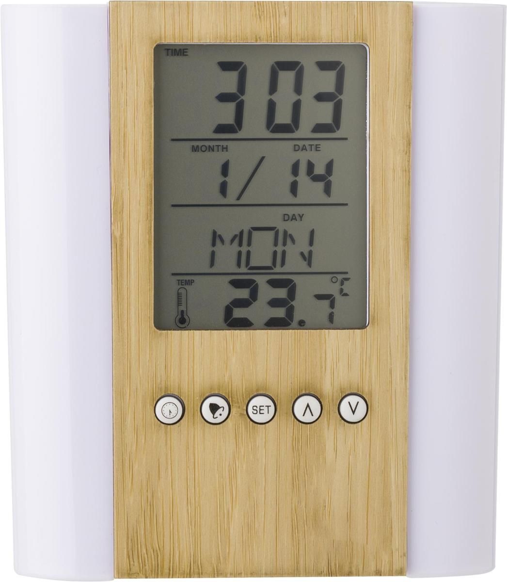 Portalápices de bambú y plástico con reloj multifuncional. Funciones: hora, termómetro interior, calendario (día, fecha, mes), alarma y repetición, temporizador y recordatorio de cumpleaños. Pilas incluidas.