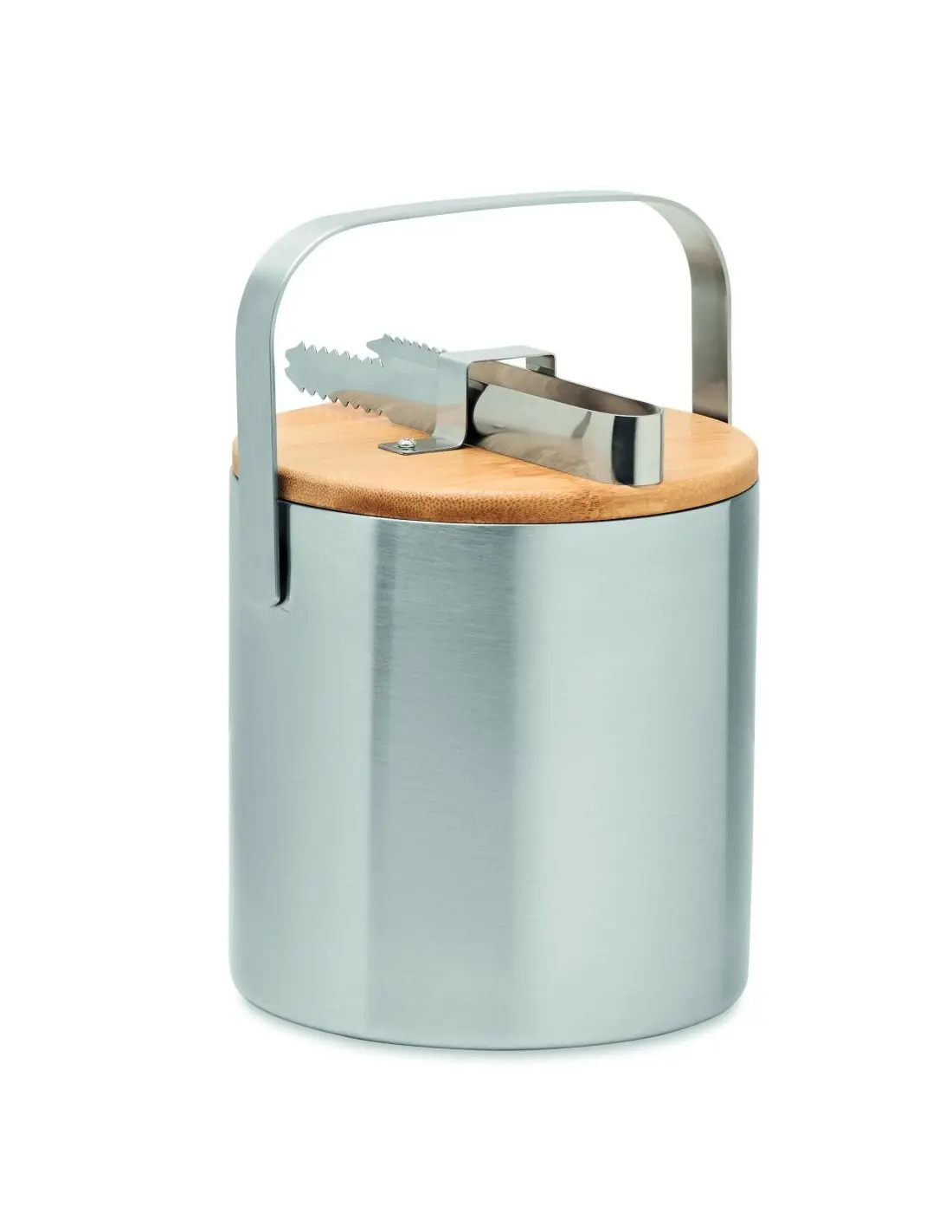 Cubitera de acero inoxidable aislada de doble pared con tapa de bambú y pinzas para hielo. Capacidad: 1200 ml. El bambú es material natural, el color del articulo puede variar.