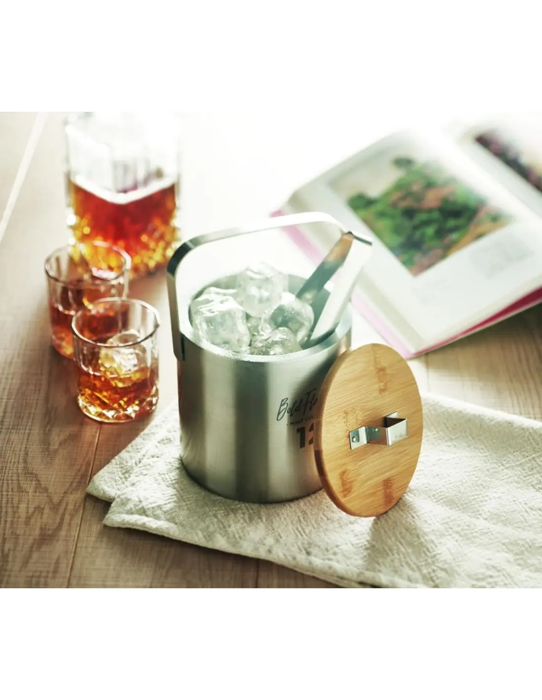 Cubitera de acero inoxidable aislada de doble pared con tapa de bambú y pinzas para hielo. Capacidad: 1200 ml. El bambú es material natural, el col…