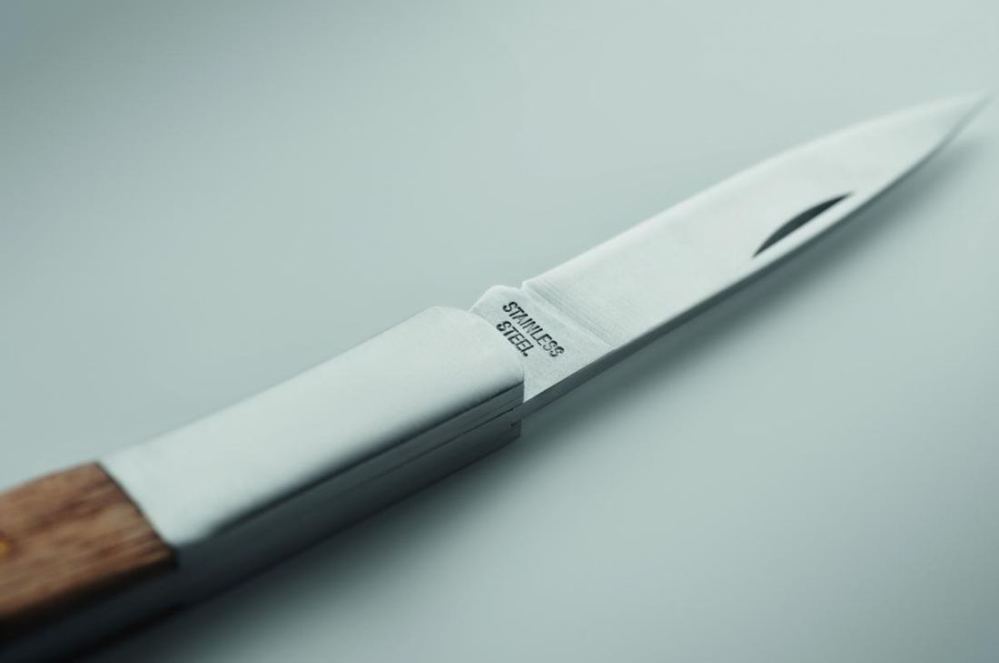 Navaja plegable de acero inoxidable con mango de madera de acacia.