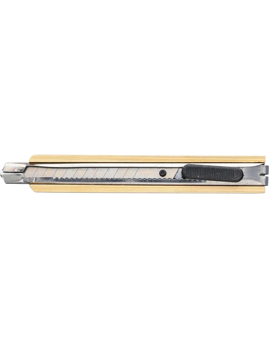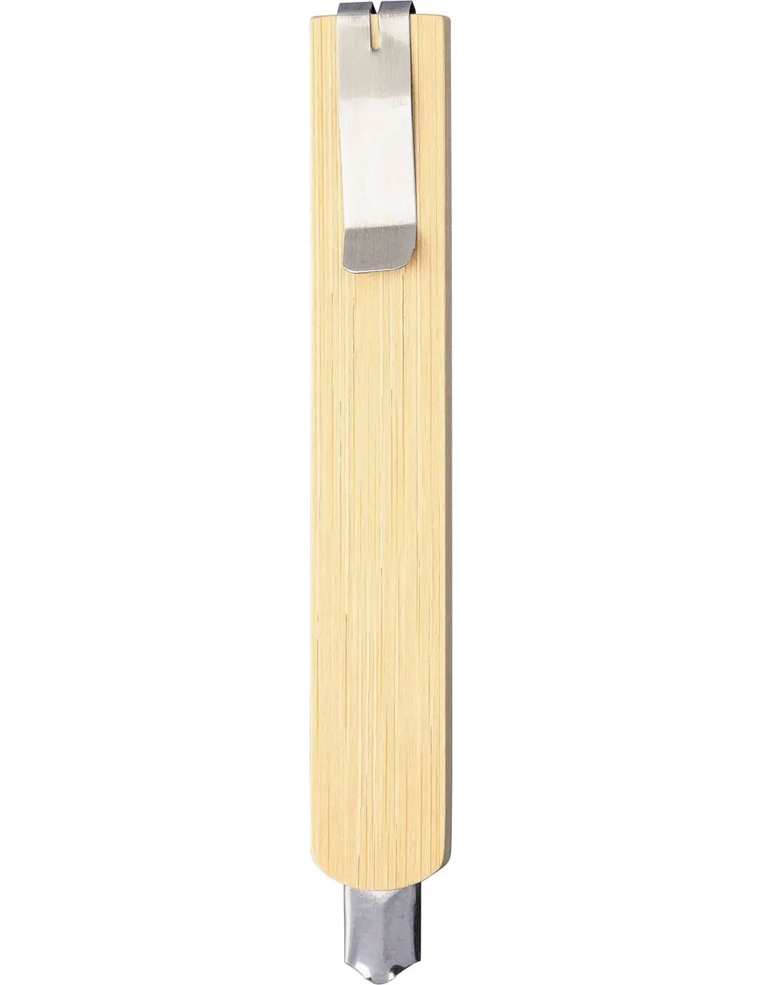 Cúter de metal con cuerpo de bambú. Cuenta con un clip de metal en la parte posterior para sujetarlo cuando no esté en uso. Las hojas están hechas de acero al carbono. Presentado en una bolsa de plástico reciclada.