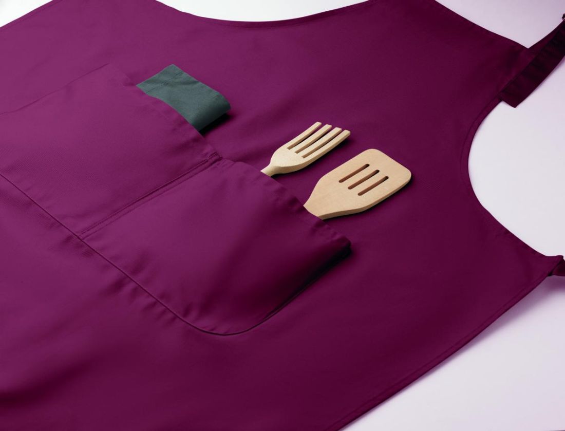 Delantal de cocina largo y ajustable de polialgodón de 240 gr/m² (35% algodón, 65% poliéster) con dos bolsillos delanteros y correa ajustable con hebilla metálica.