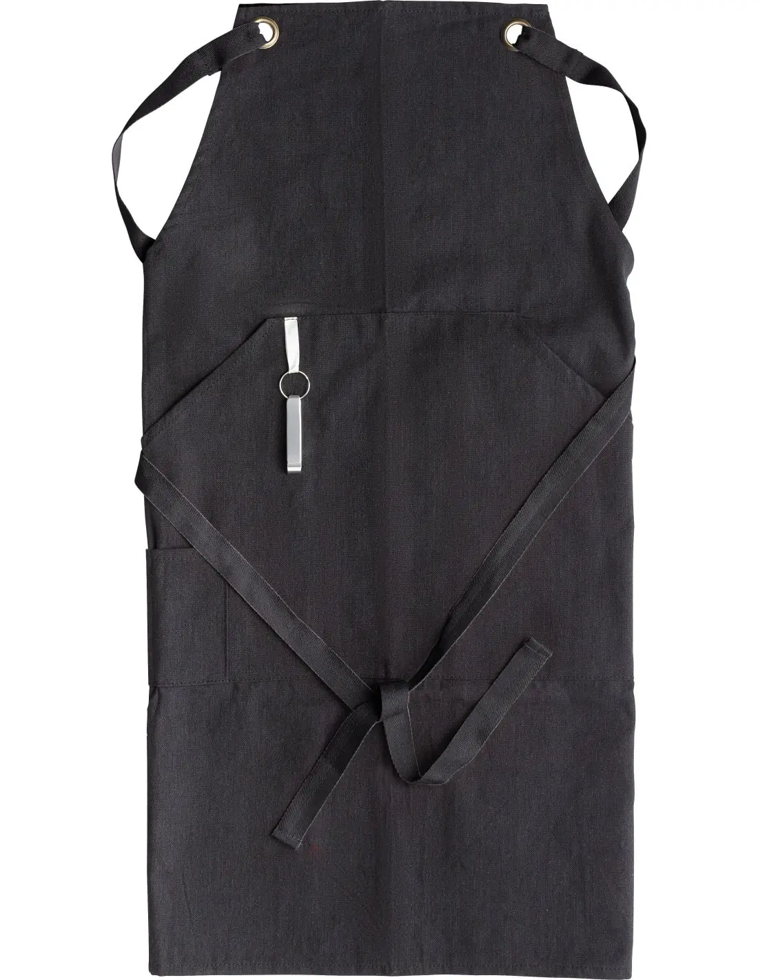 Delantal de algodón y poliéster con cintas coloreadas para atar en varias posiciones. En el bolsillo frontal tiene un abrebotellas.